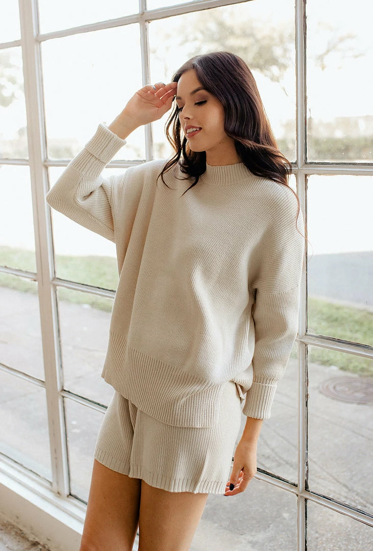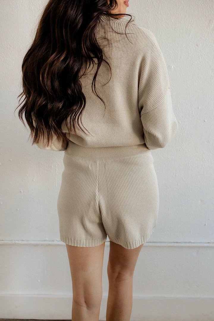 Get cozy by the fire in this beige set! Our Owen Ribbed High Rise Shorts come in an soft knit. Designed with an elastic drawstring waistband and a high rise fit. Finished with a relaxed style.