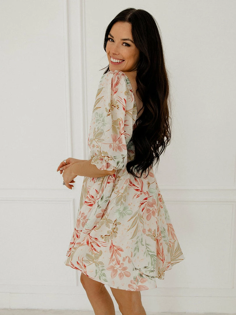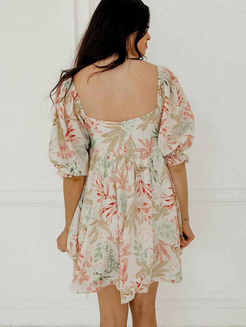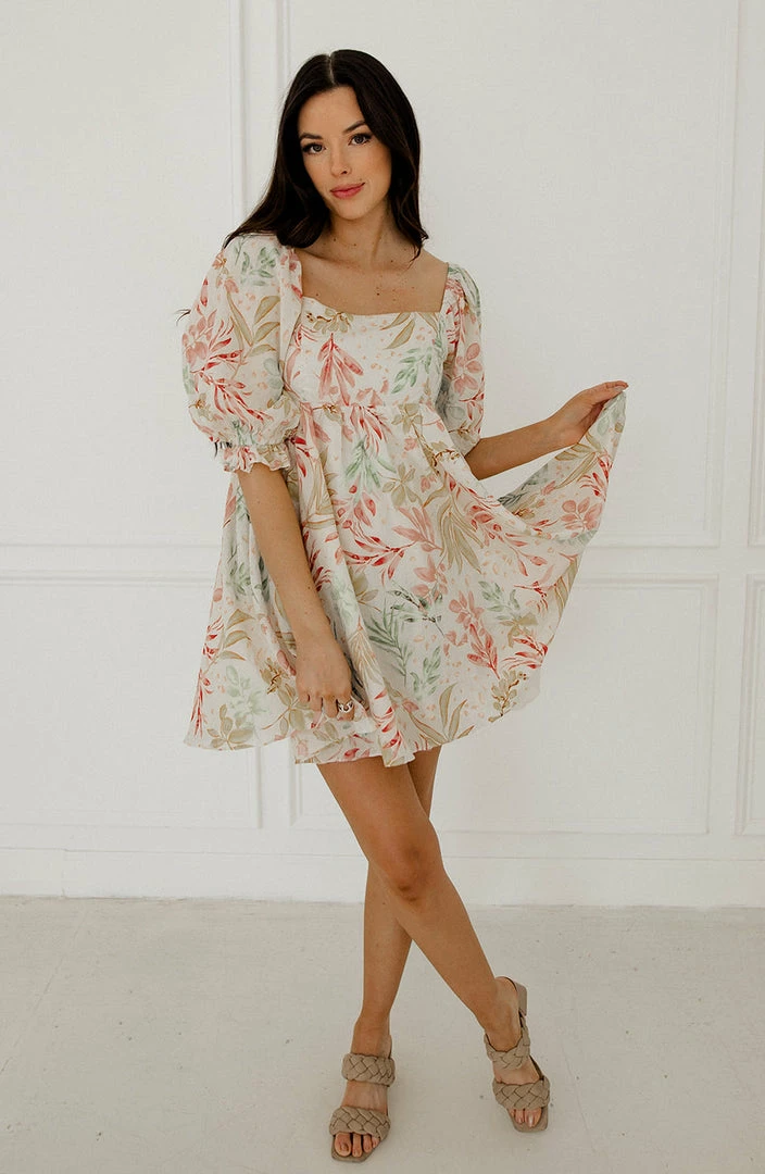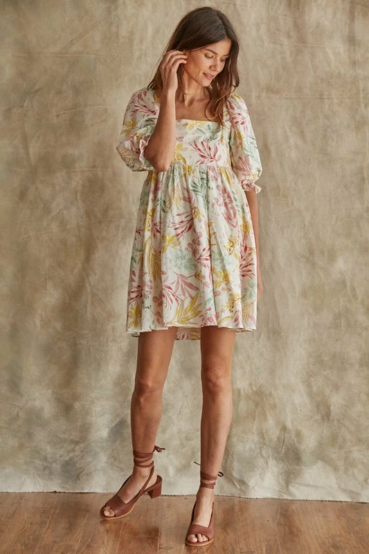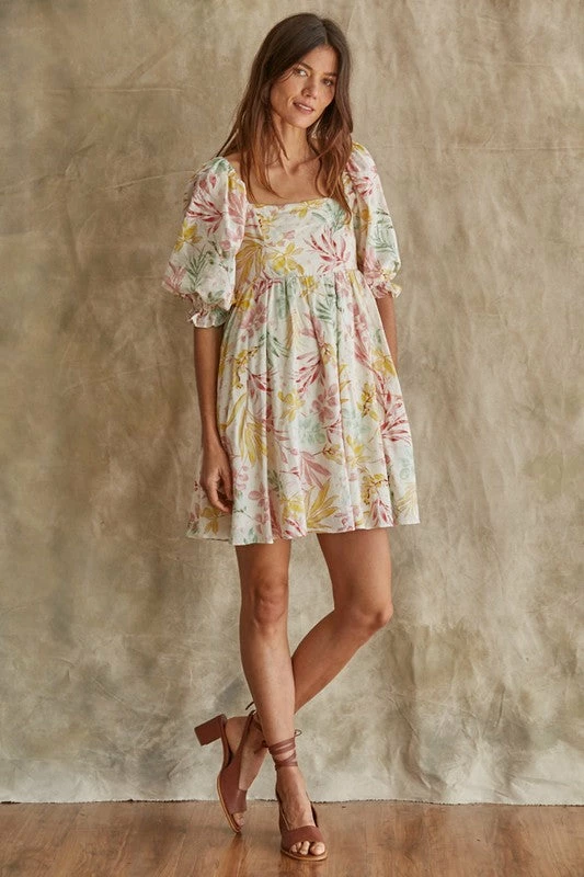We love a dress that’s equally as cute as it is comfortable! Our Paradiso Puff Sleeve Babydoll Dress is a cream base with florals in mint, pink and mustard. The babydoll silhouette and square neckline make this dress so cute & fun!