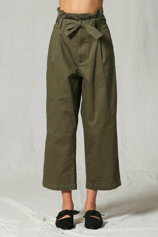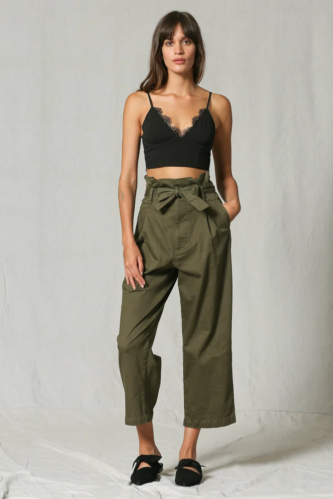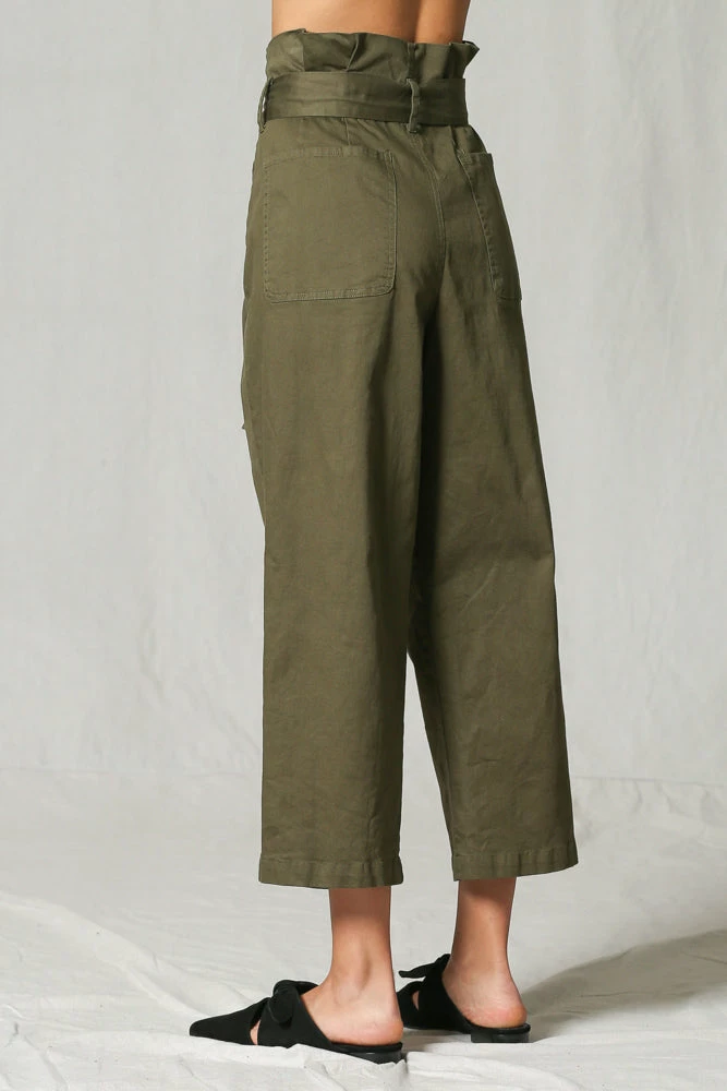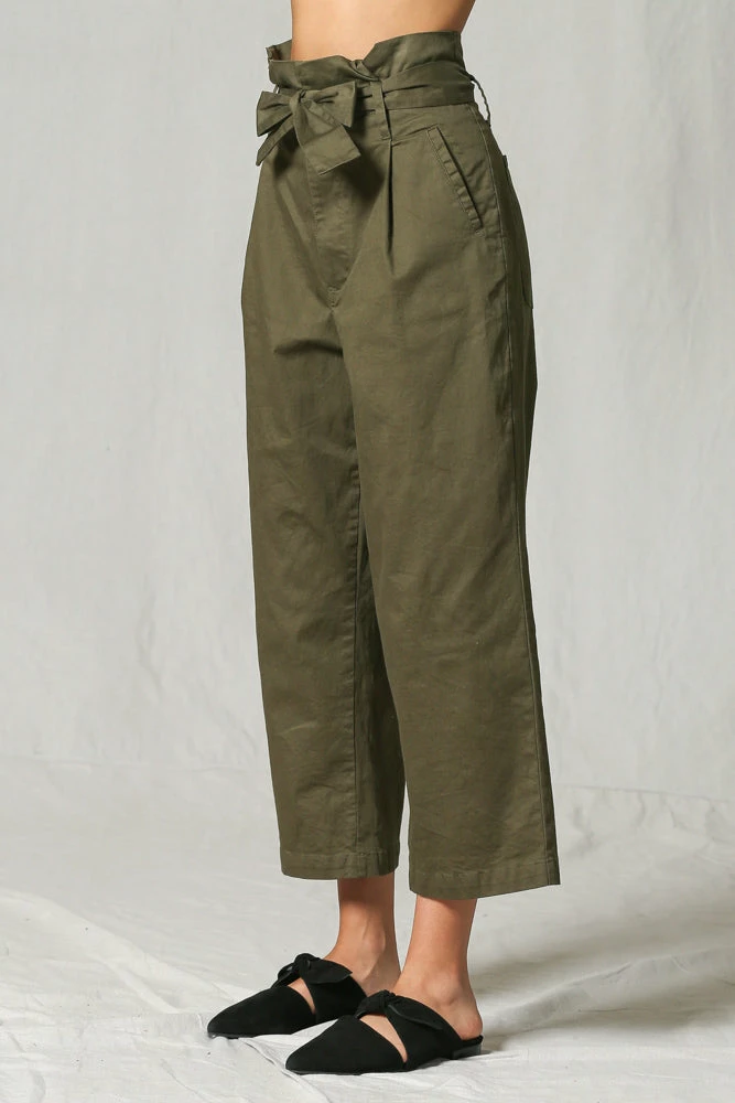 Prove just how fabulous you are in our Pocketed High Rise Tie Trousers! These olive paper bag waist trousers sit high waisted and cinched with a removable fabric waist tie. Designed with two pockets and a chic straight leg. The perfect work to weekend pants! Finished with a front fly zipper and button closure.