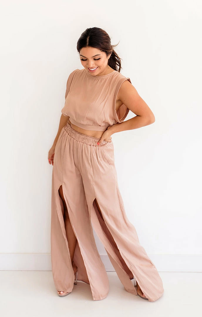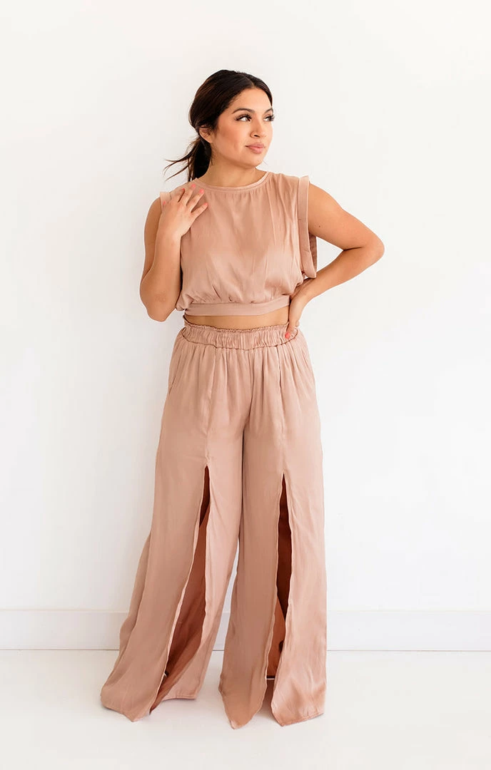 Try a silky top with our matching pants for the ultimate resort outfit! Our Pure Bliss Satin Crop Top in black features a crew neckline. Secured with a back keyhole and neckline button closure.
