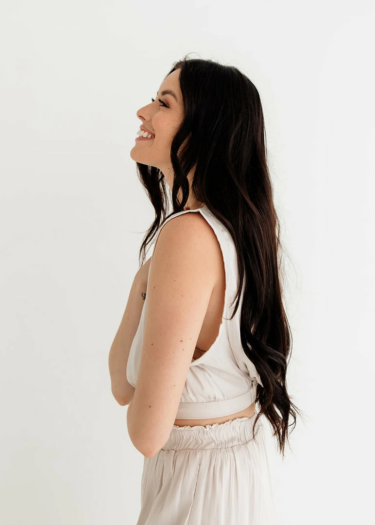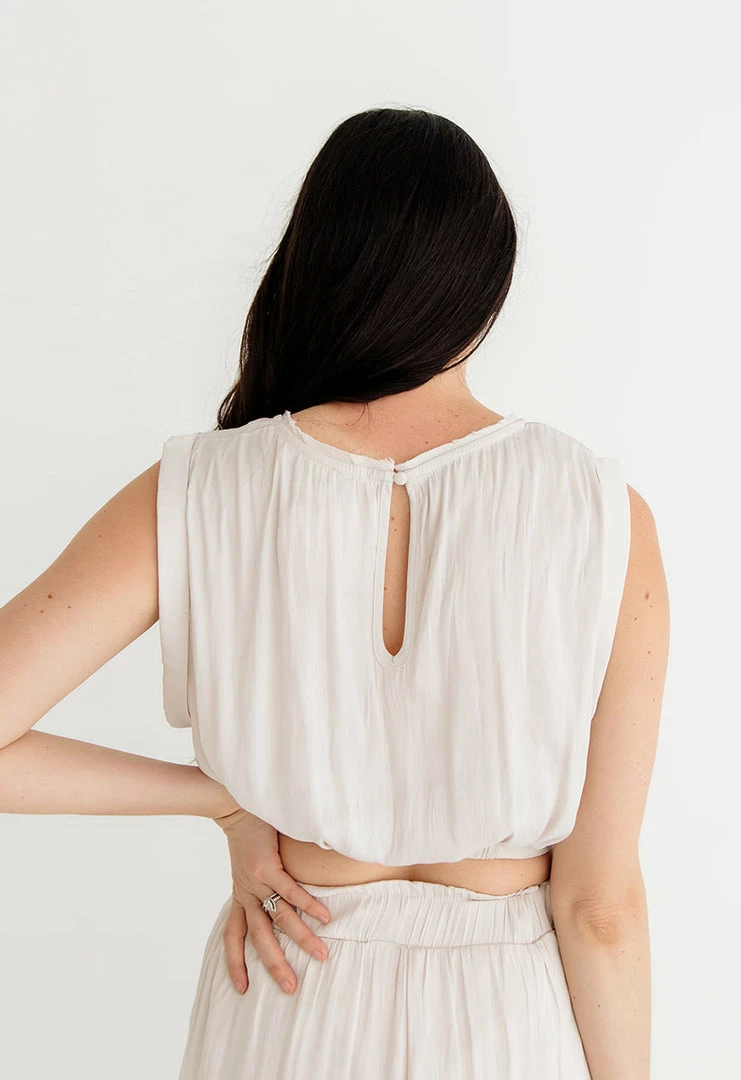Try a silky top with our matching pants for the ultimate resort outfit! Our Pure Bliss Satin Crop Top in pearl features a crew neckline. Secured with a back keyhole and neckline button closure.