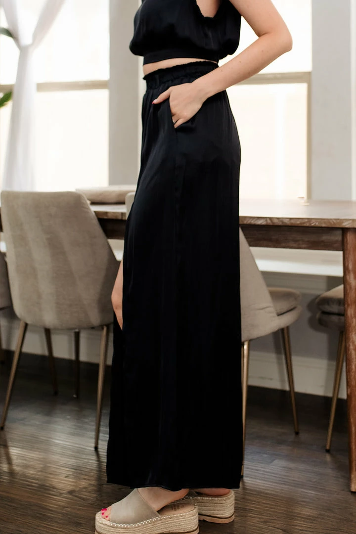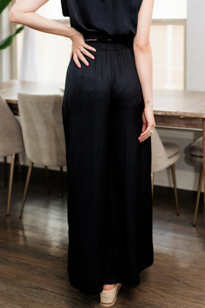 Lounging in satin sounds like a dream! Our Pure Bliss Slit Satin Pants upgrade your at-home look in their black hue with an elastic smocked waist. This style has lined shorts for coverage! These high rise wide leg pants are a must have! Styled with the Pure Bliss Satin Top.