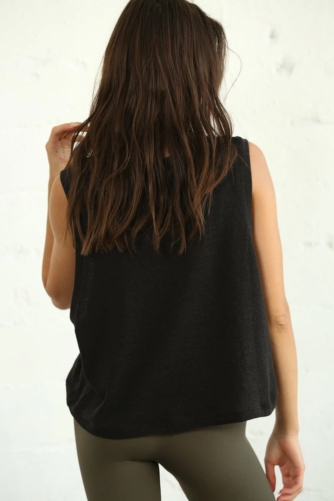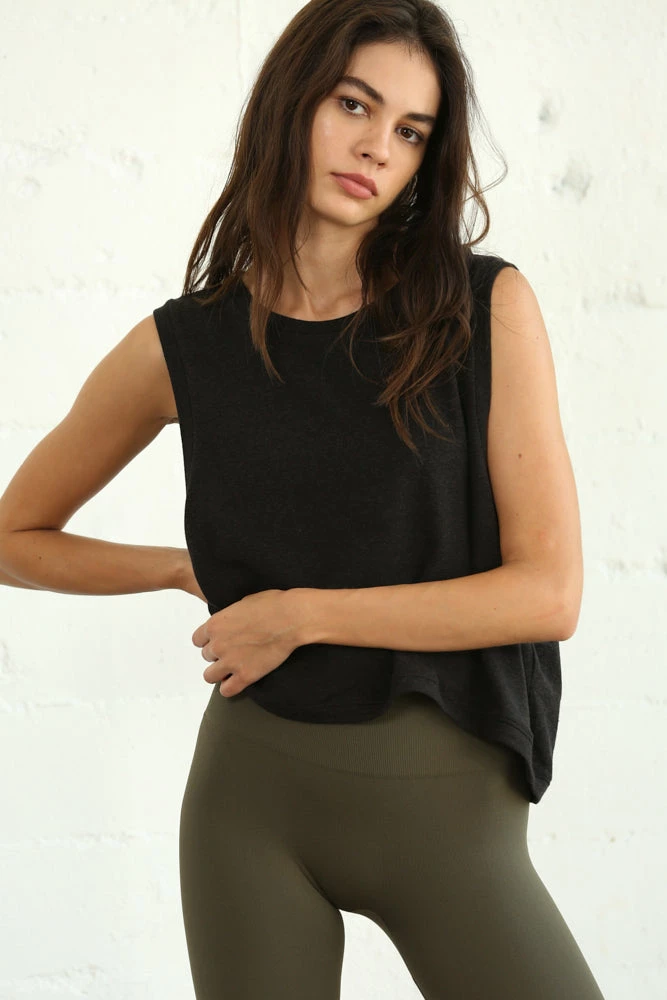 //Best Seller// TheReboot Muscle Tank is a proven essential. Fit with a crew neckline, sleeveless silhouette and relaxed body. The black muscle tanks’ lightweight, soft and stretchy fabrication makes for an effortless styling piece. Keep it simple and casual with a bralette and matching shorts for the ultimate look.