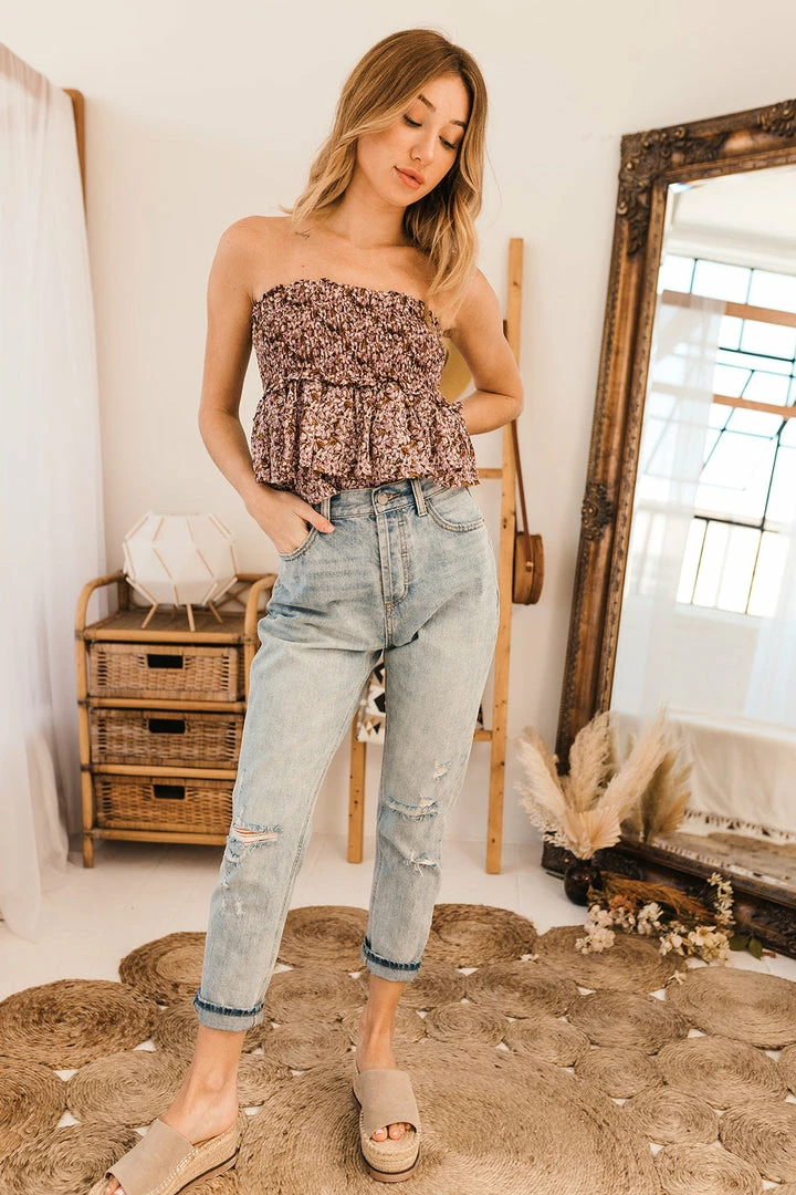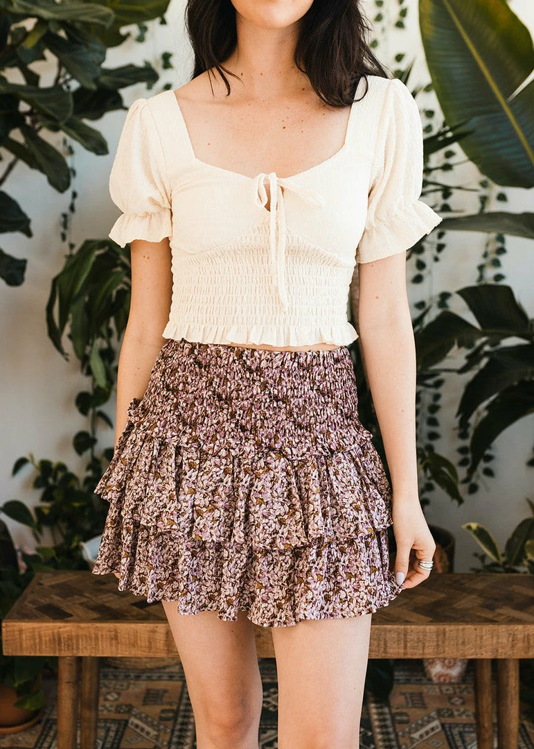 Turn heads in this floral top or skirt! You can wear this how ever you’d like! Our River Floral Smocked Ruffle Skirt Or Tube Top features florals in plum, white, and a hint of camel with a smocked waist and a ruffle tiered body.
