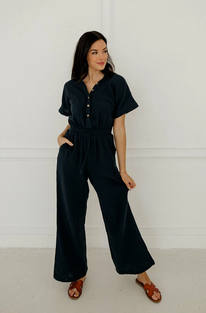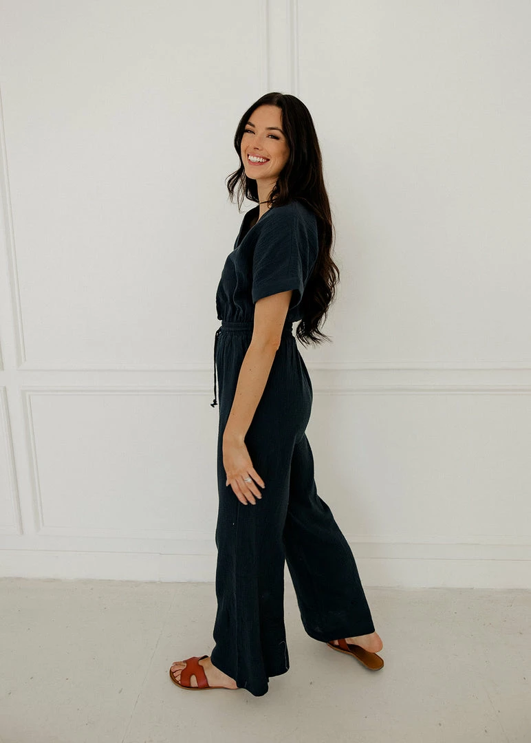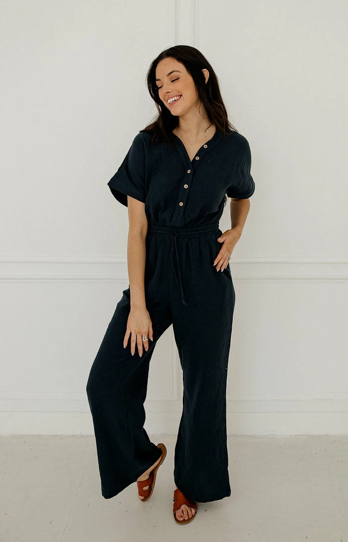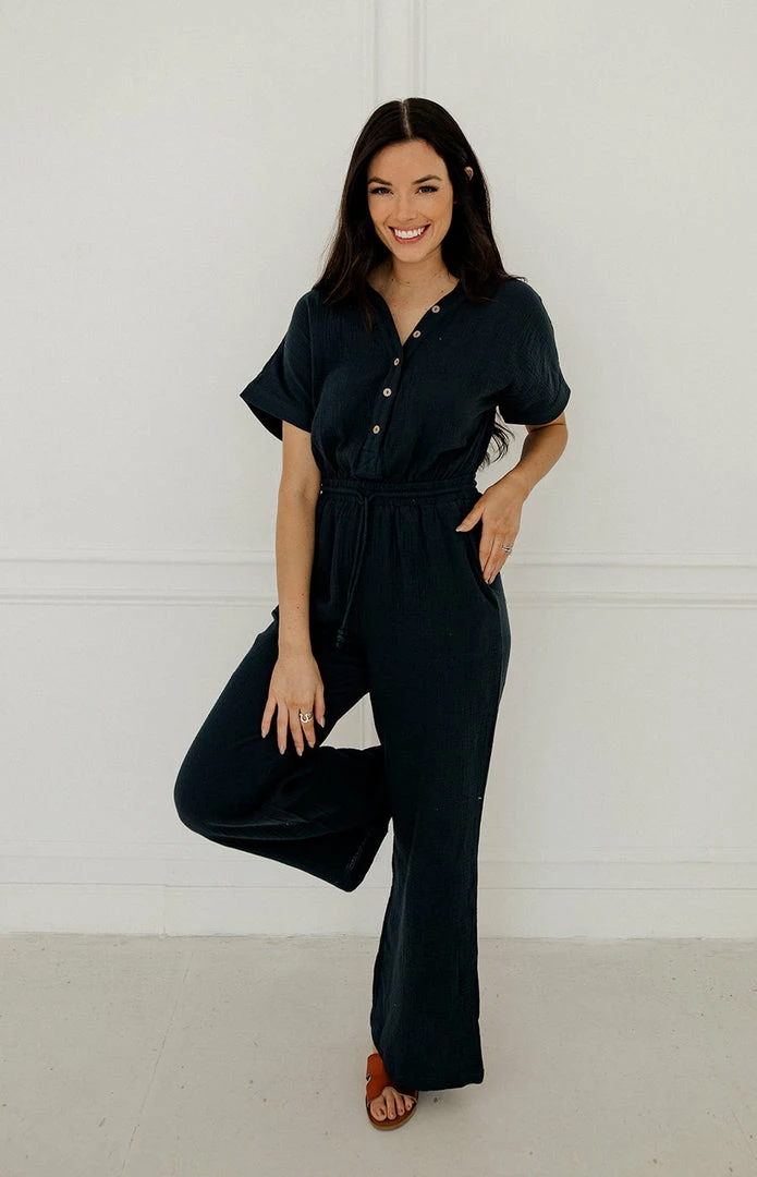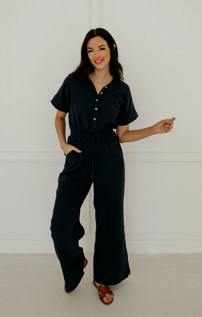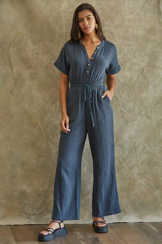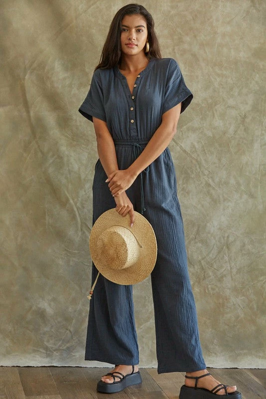 Our Maisel Cotton Button Down Jumpsuit will get you excited for spring weather! This charcoal cotton gauze jumpsuit features short sleeves and side pockets. Finished with front button closures.