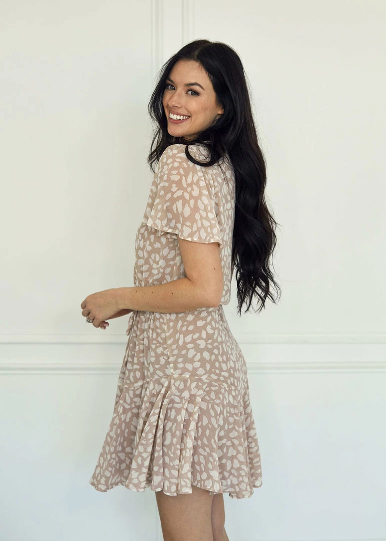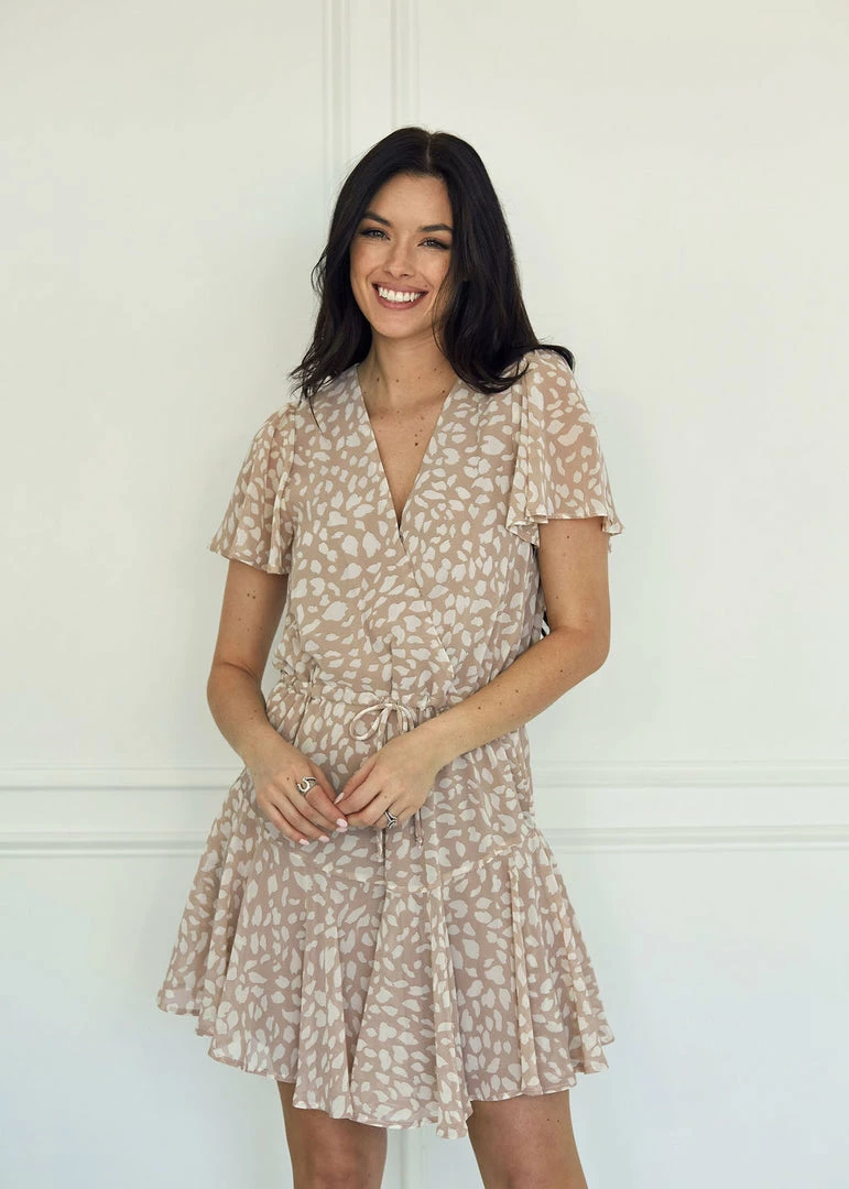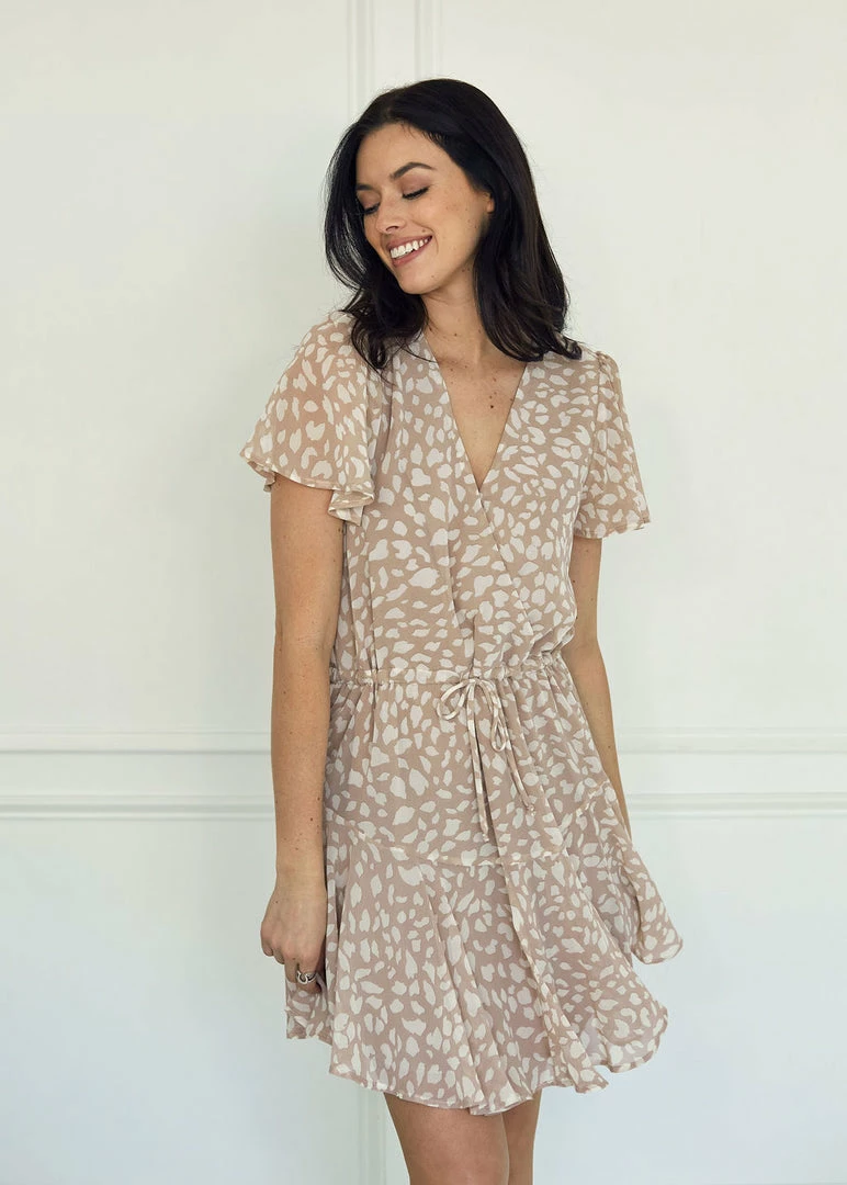 Sundress season is upon us! Our Schultz Surplice Ruffle Mini Dress is a dusty rose base with a ivory print. This relaxed v-neck dress has ruffle sleeves and an drawstring waist.