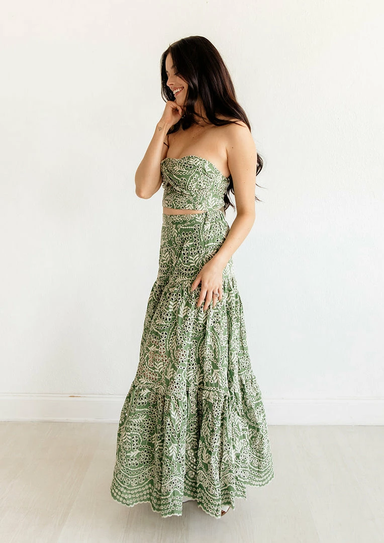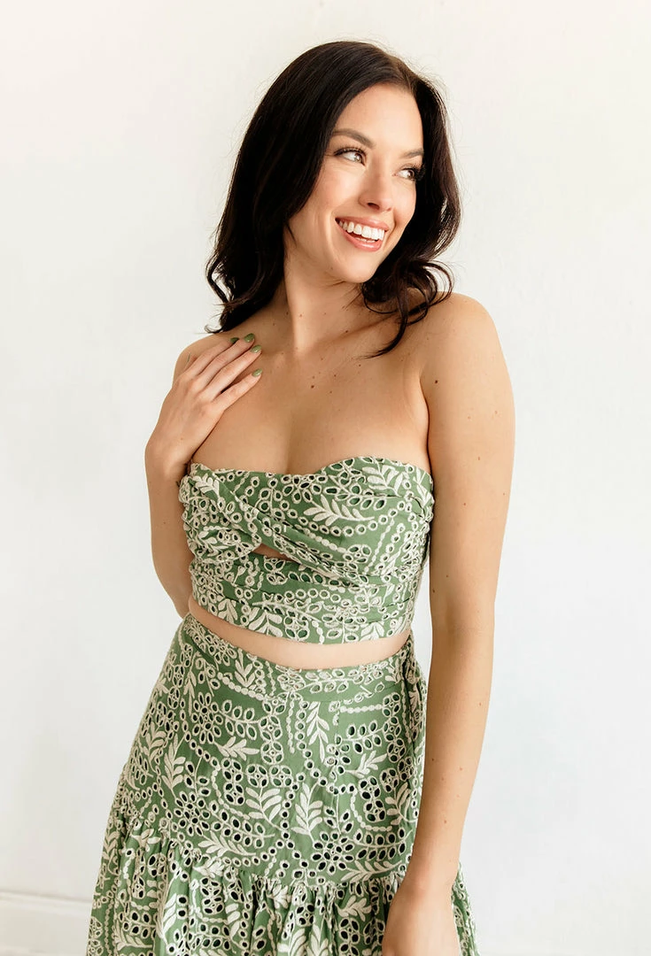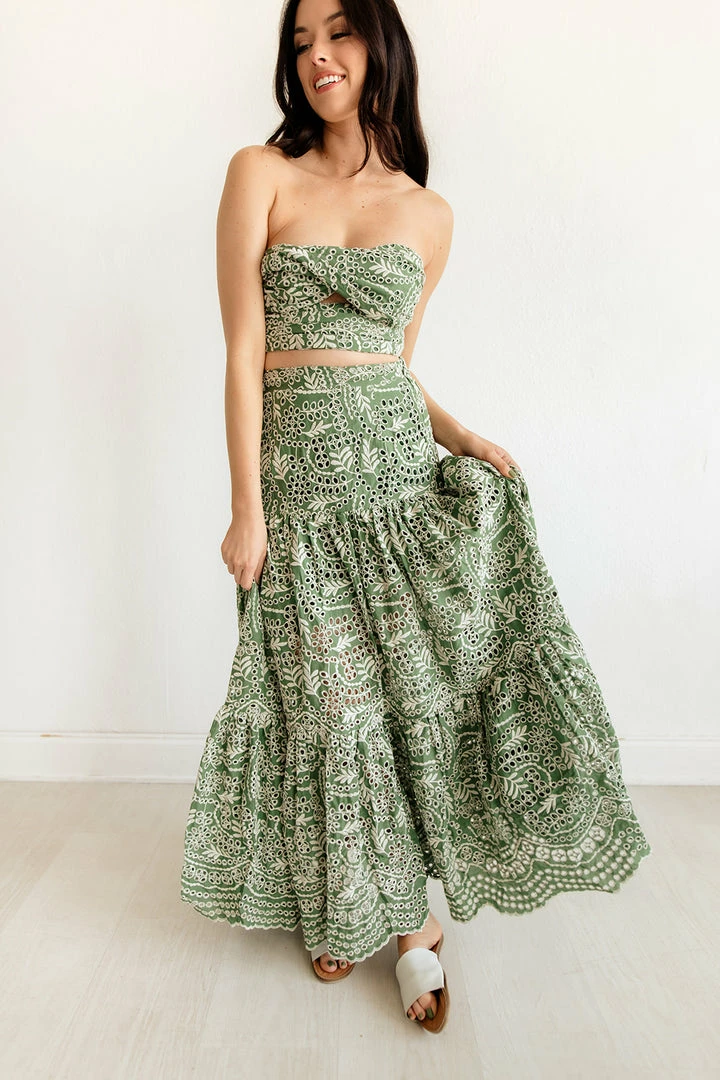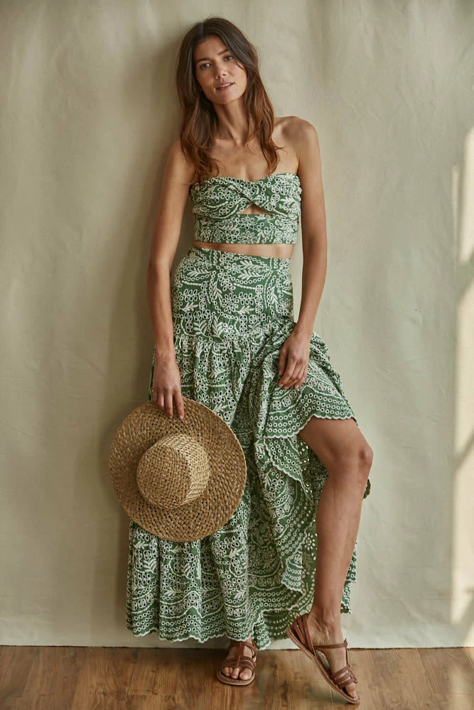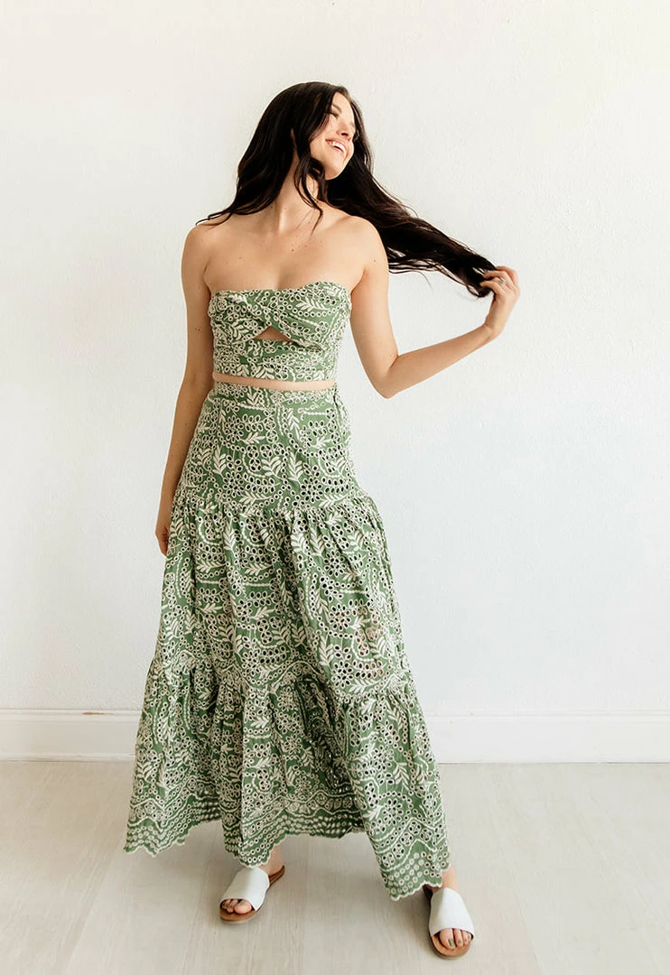 This eyelet set is so dreamy! Our Sea La Vie Eyelet Tube Crop Top comes in green with a strapless composure and a back smocking. Wear this adorable crop with the matching maxi skirt and chunky sandals.