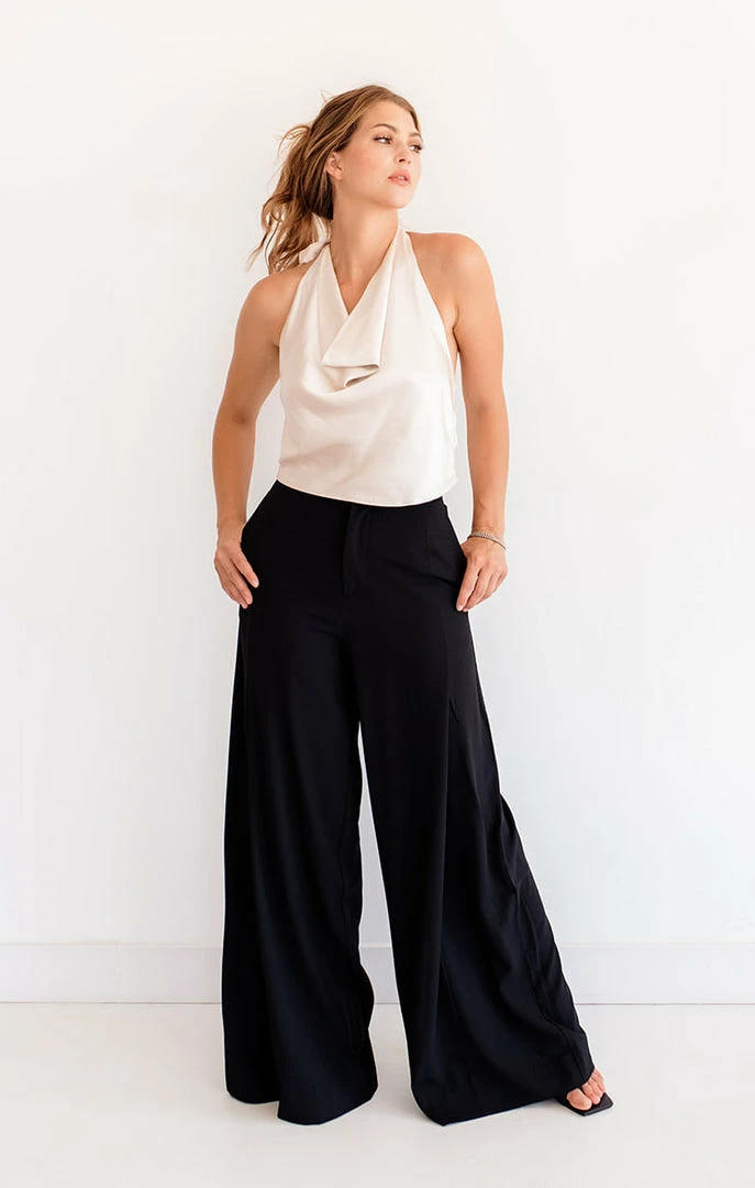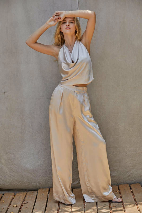 //Best Seller// The Silky Dreams Cowl Neck Halter Top adds a little luxury to your next look with a solid champagne tone on a breezy relaxed fit.