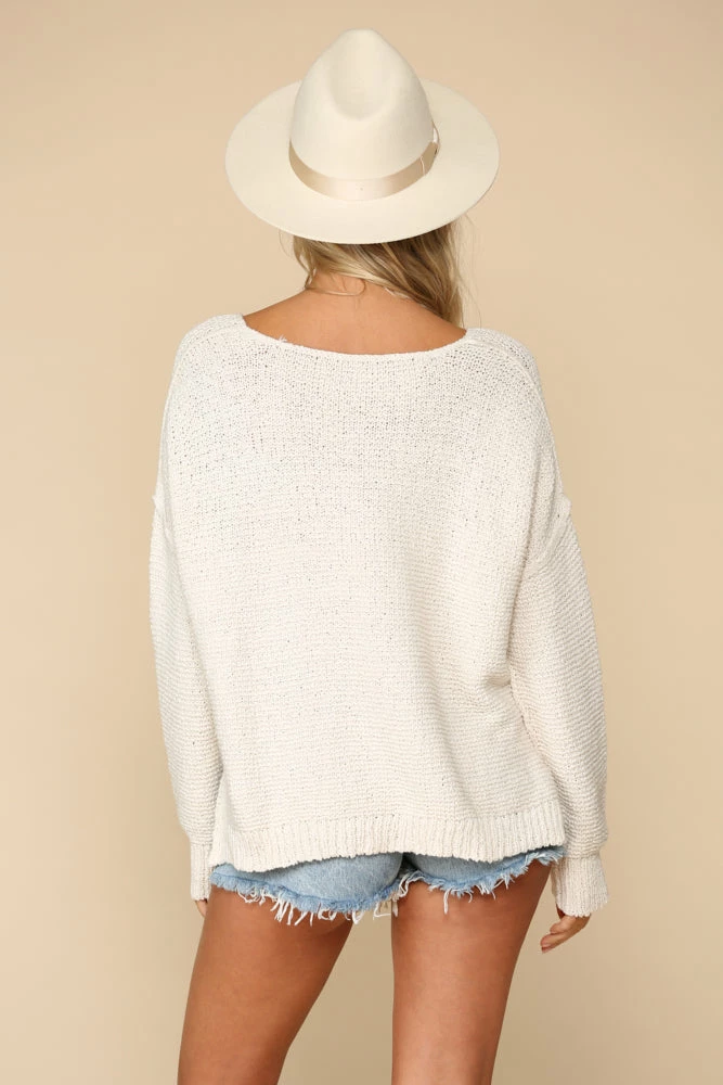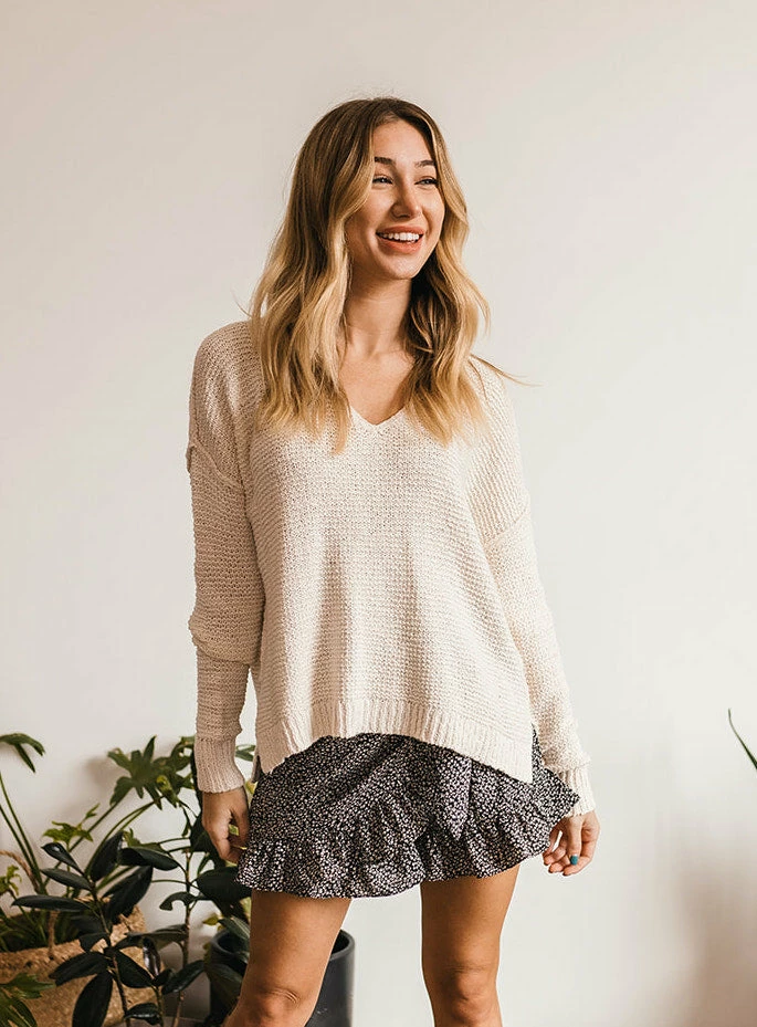 Breathe deeply in the Chasing Rainbows Cotton V-Neck Sweater So relaxed, soft and effortless, this off white sweater is the coziest ever! A subtle side slits offer the perfect tuckable style.