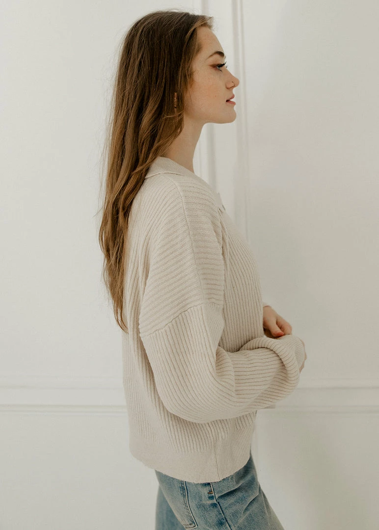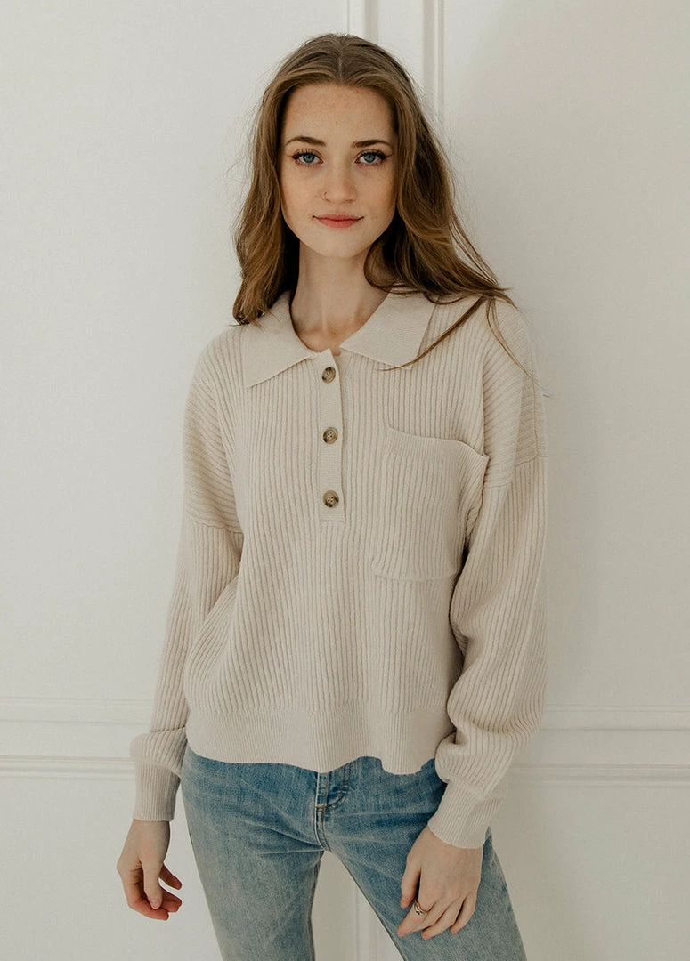 Casual days are what this henley is made for! OurDutch Knit Button Down Placket Sweater looks so fab with light or dark denim. This cream ribbed knit sweater has long sleeves and front henley button closures with front chest pocket.