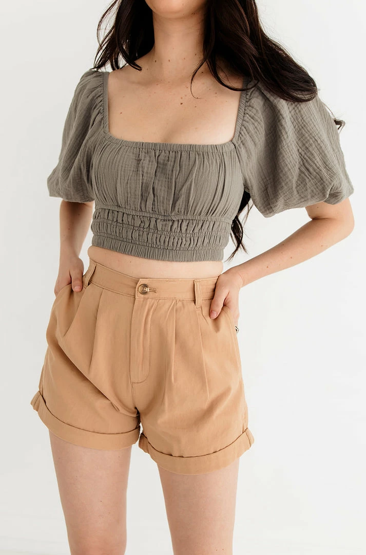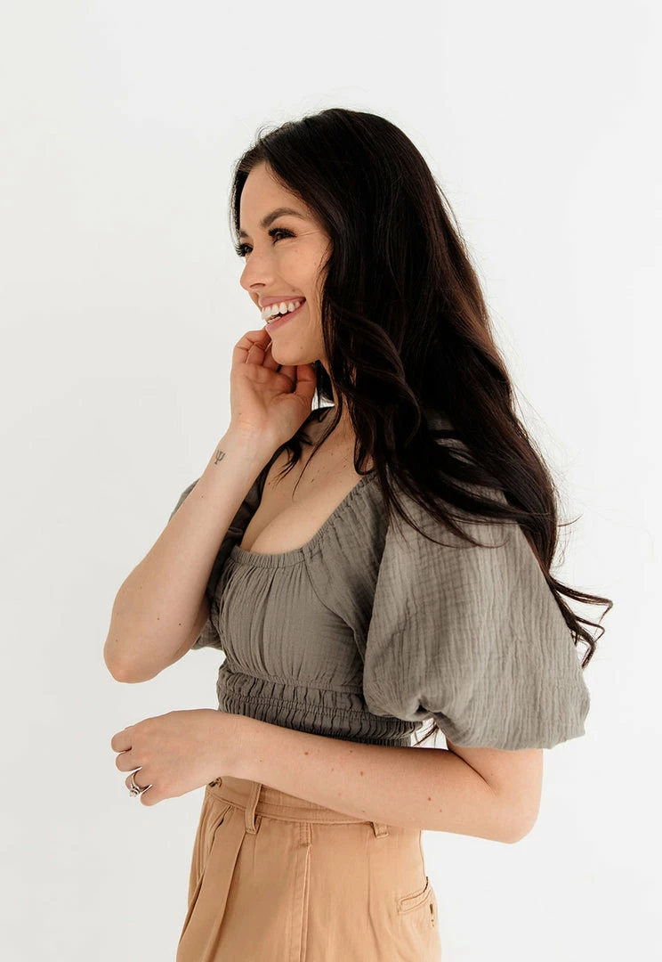 Ready for resort days, the Ferrah Billowed Sleeve Zipper Crop Top in dark sage features an off the shoulder neckline.