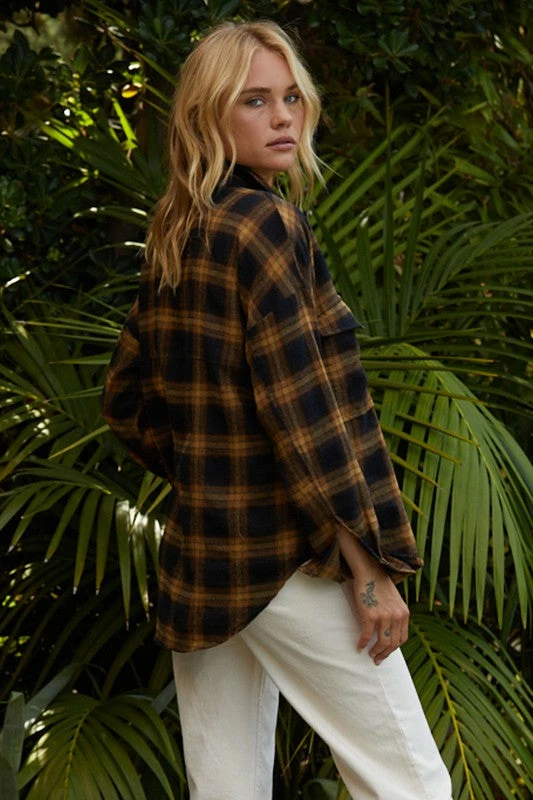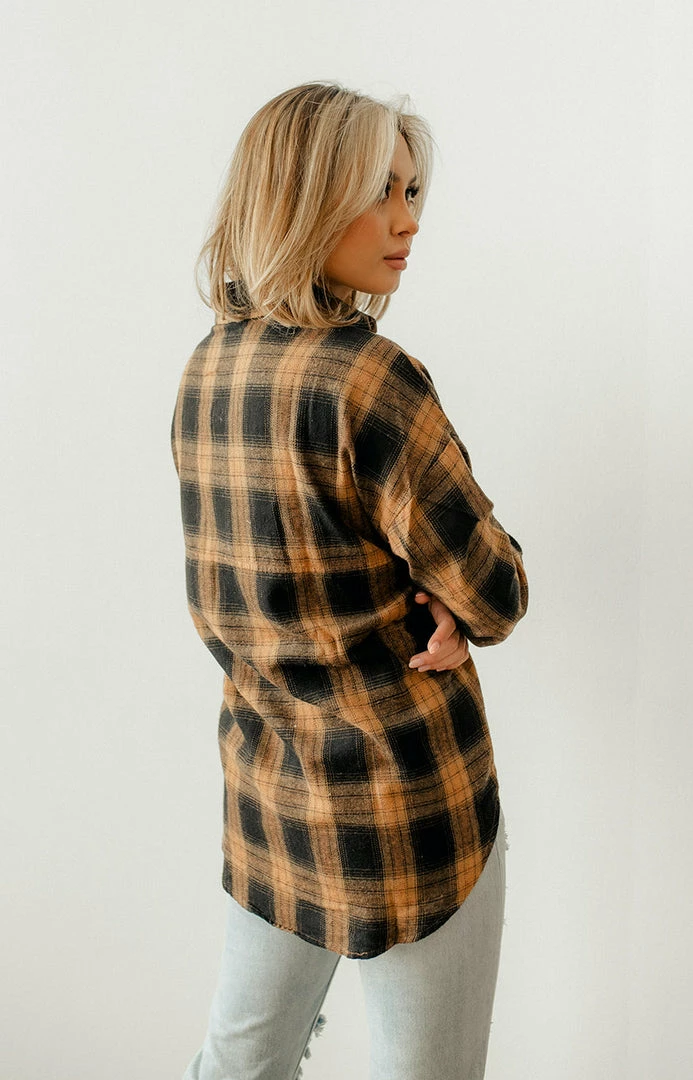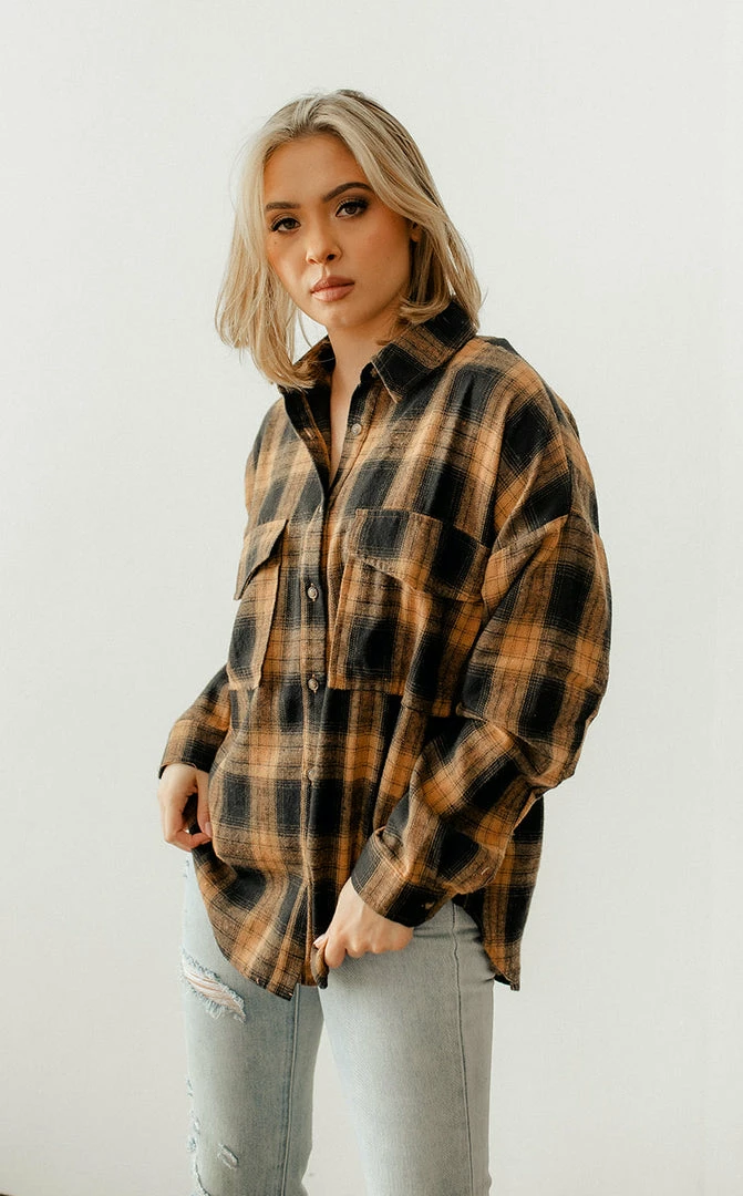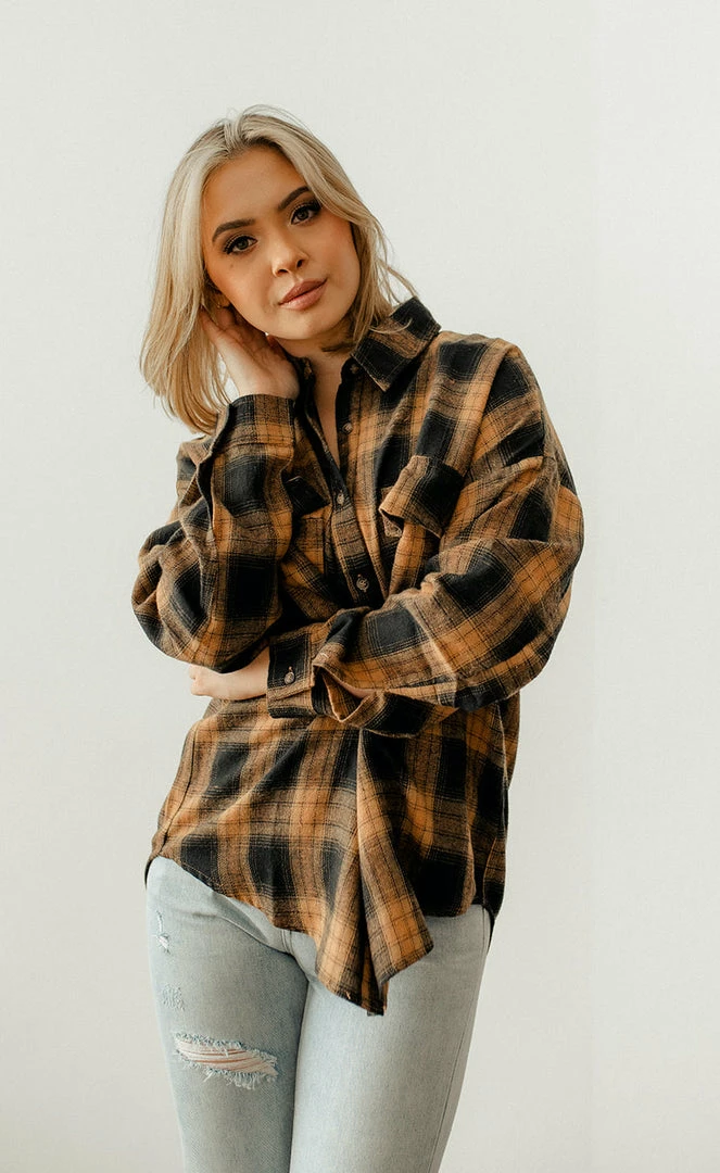 Add a layer of warmth and style in our Grizzly Peak Plaid Button Down Top! This black & butterscotch plaid top is crafted with a bust pocket. Finished with a collar.