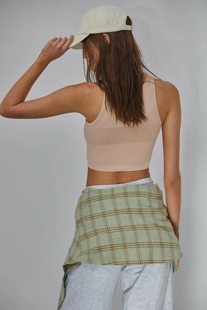 Our Headstart Seamless Textured Crop Top is a closet hero! This seamless knit top is perfect for layering under cardigans, blazers or just as it is! Designed with a crew neckline and a sleeveless silhouette.