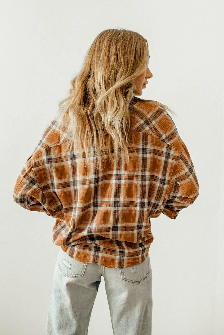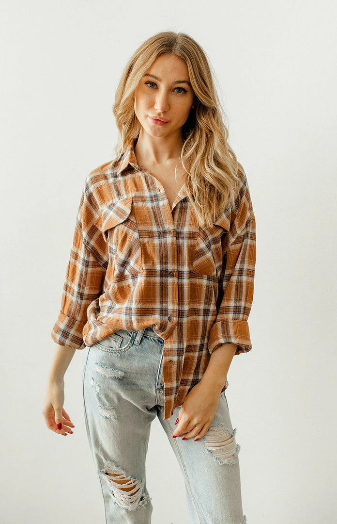 We can’t wait to rock our Journey Oversized Plaid Flannel Shirt Top all fall long! Blue, orange/camel and off white hues craft this cotton top. Front button closures and bust pockets finish this piece.