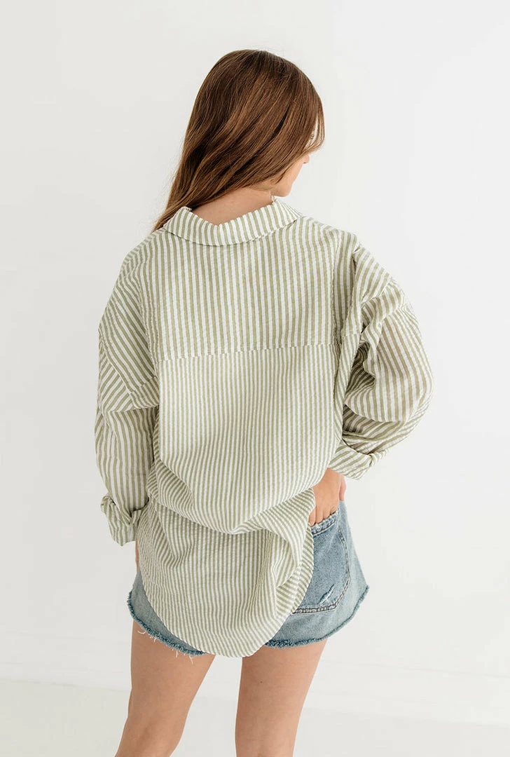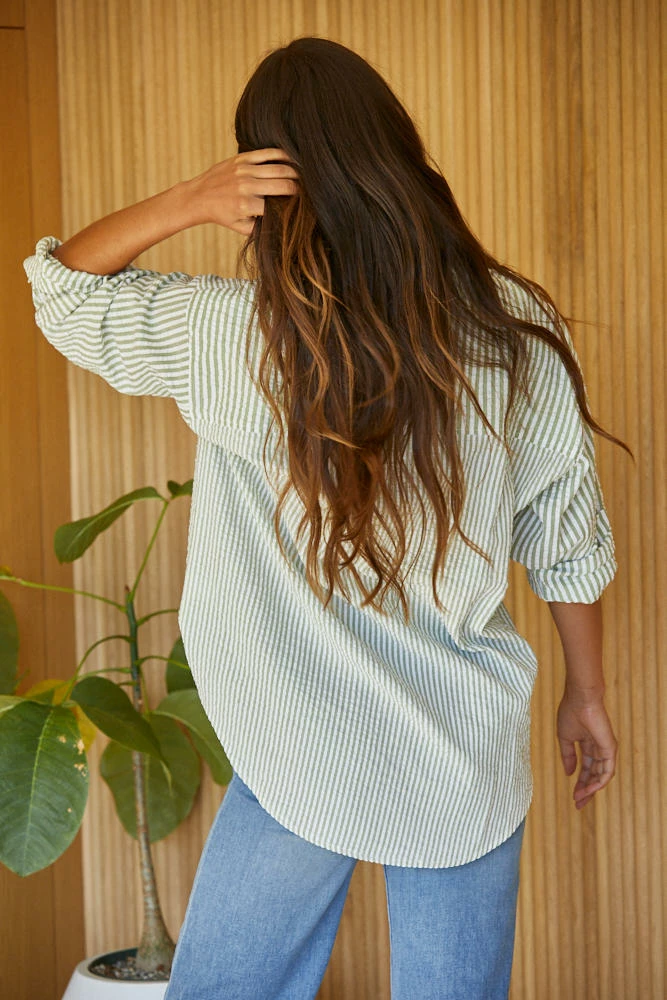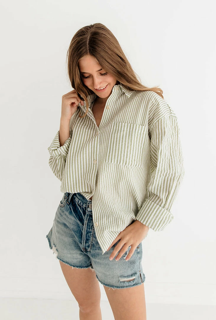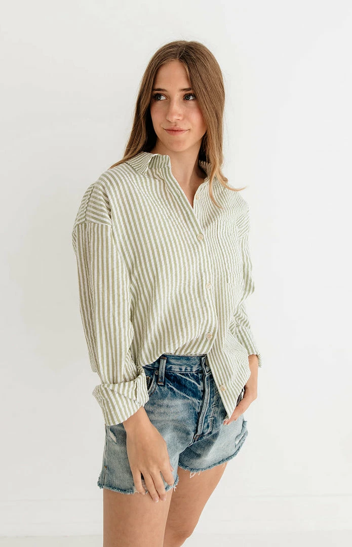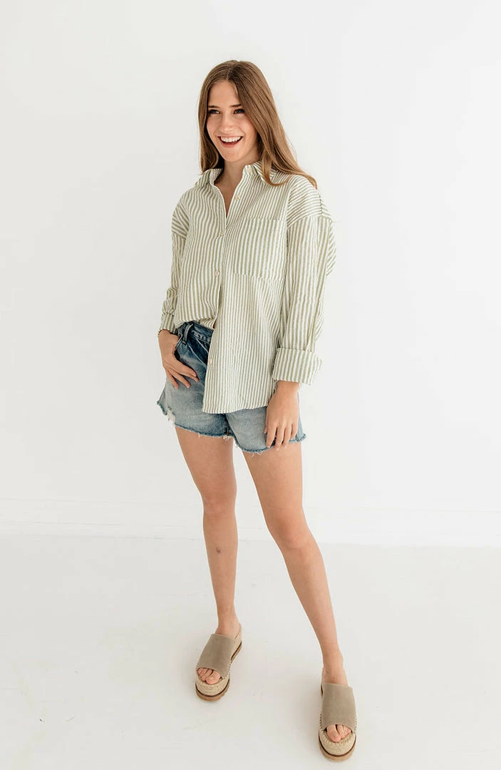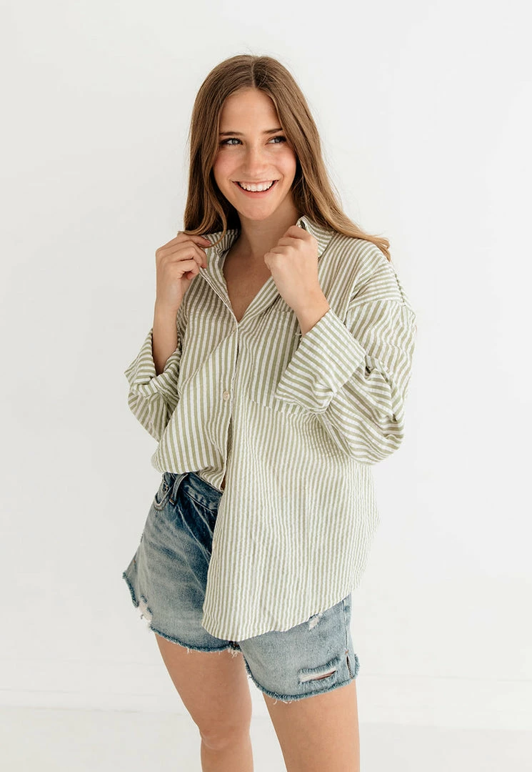 Mix business and causal in the Ralph Pinstripe Button Down Top in green and white with a collar and front button closures.