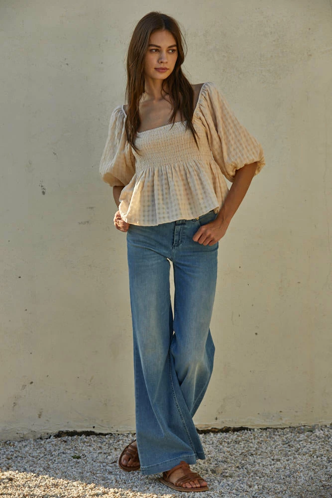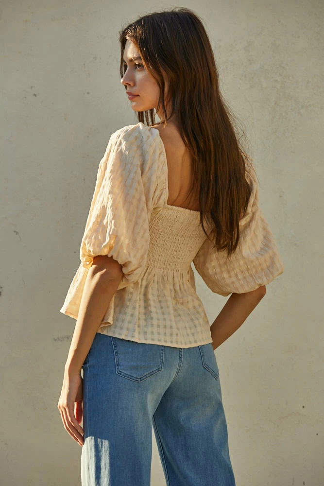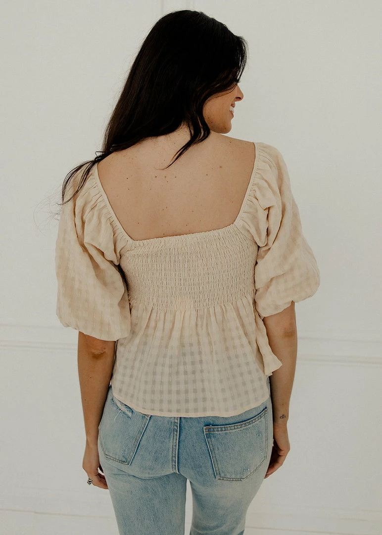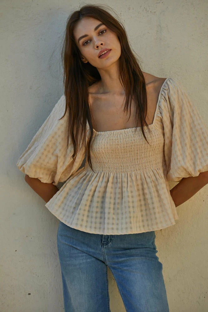 Our Sugar Cotton Smocked Babydoll Top has such a Sunday vibe! The gingham fabrication decorate the cream natural base. Designed with half puff sleeves and a square neckline.
