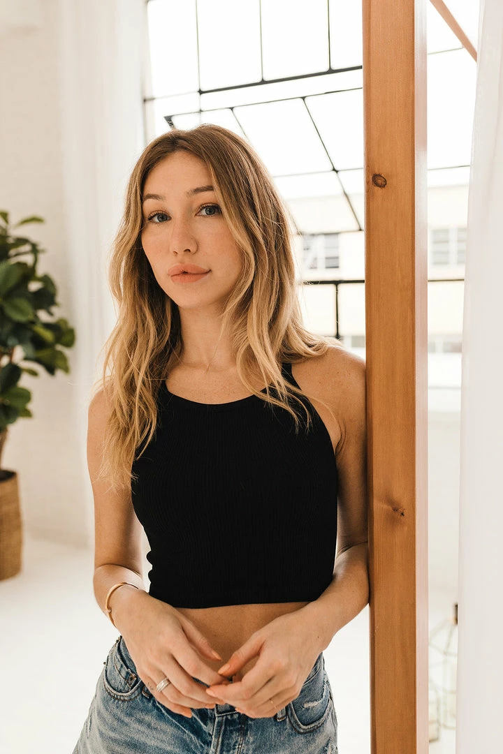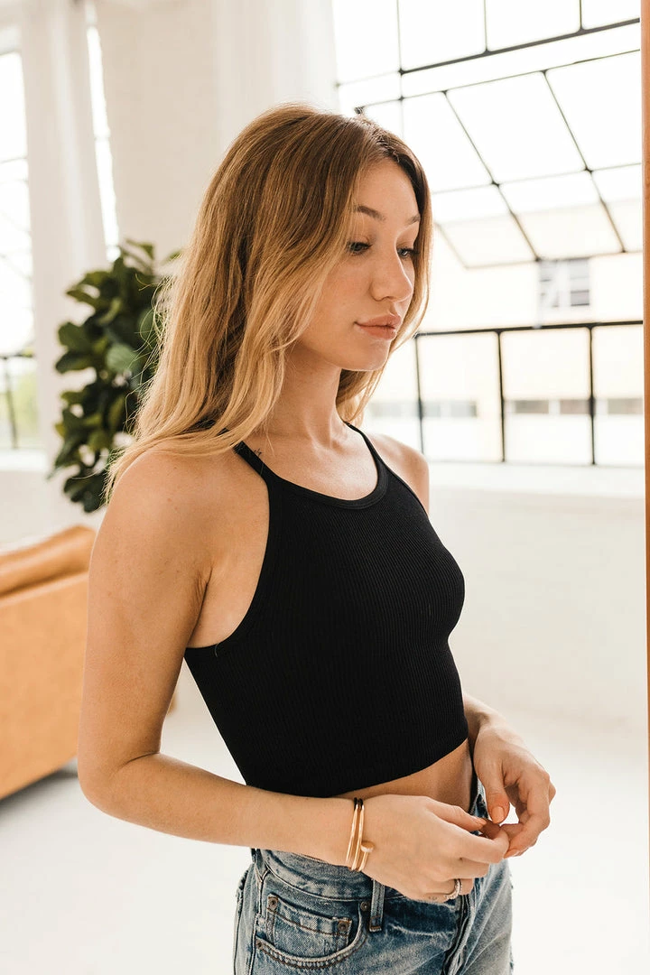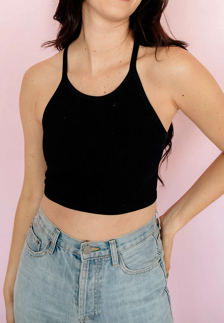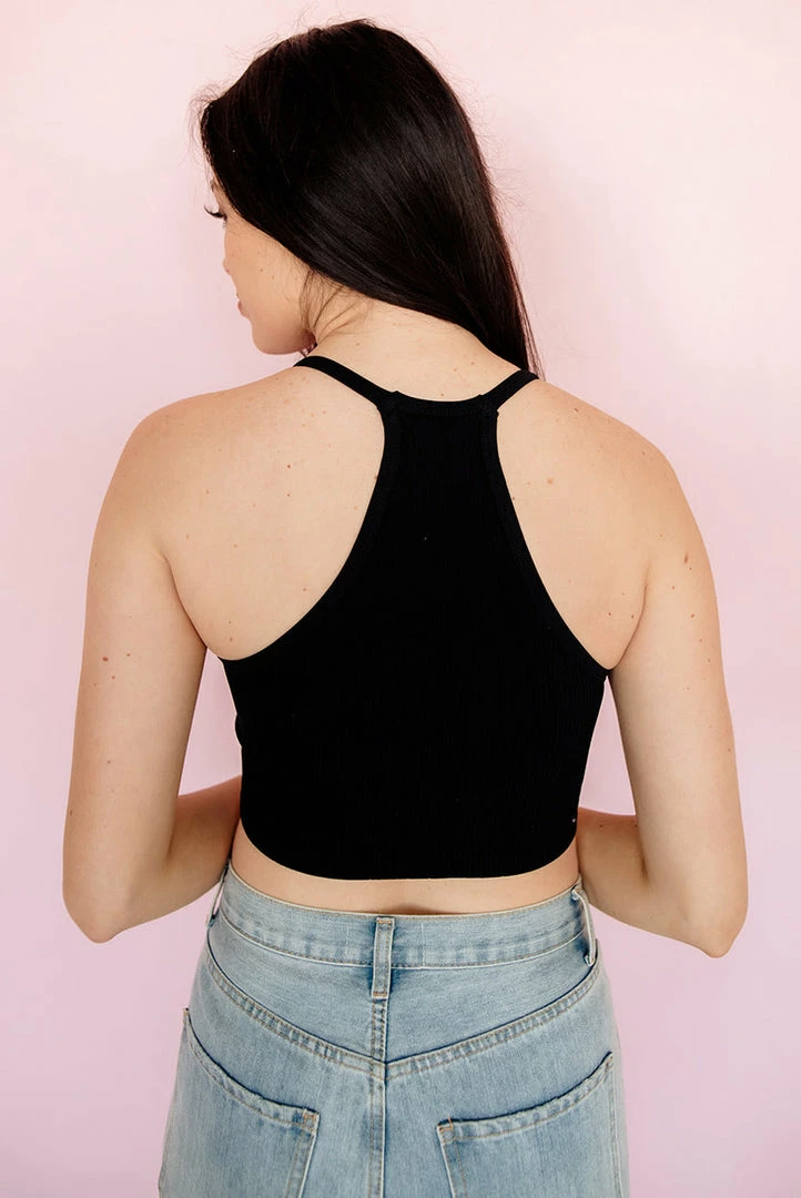 Sporty chic meets comfy in our Tammy Ribbed Racerback Brami! This black ribbed knit brami is a racerback style with fixed straps. This fitted and stretchy cropped top is so flattering! Pair it with your fav high waisted joggers.