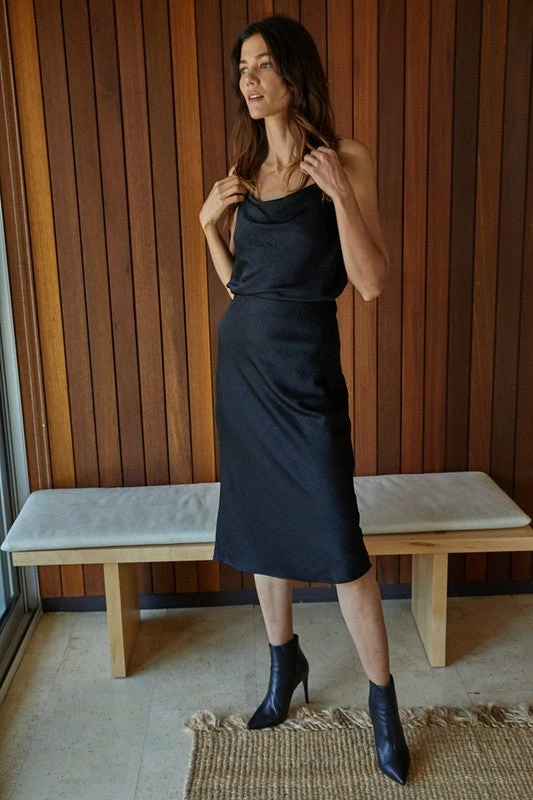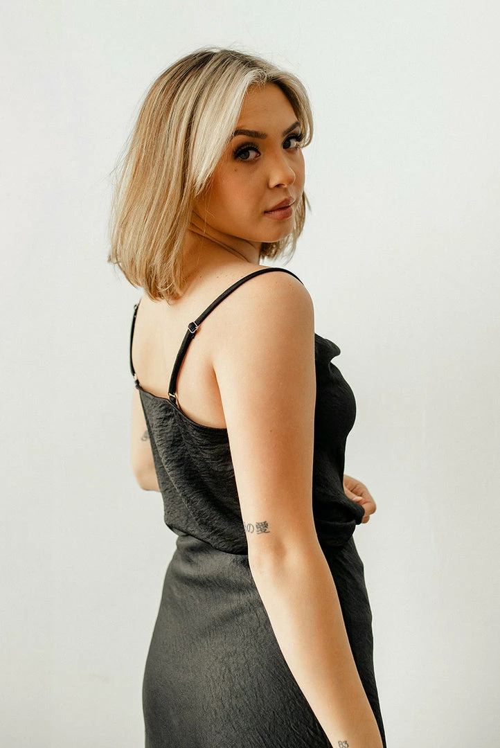 Our Trish Satin Cowl Neck Cami Tank is a sexy and sleek style with the utmost versatility. Crafted in a vintage champagne hue, this luxe tank features a draped cowl neckline and adjustable straps. A slimming fit that looks great no matter the season!