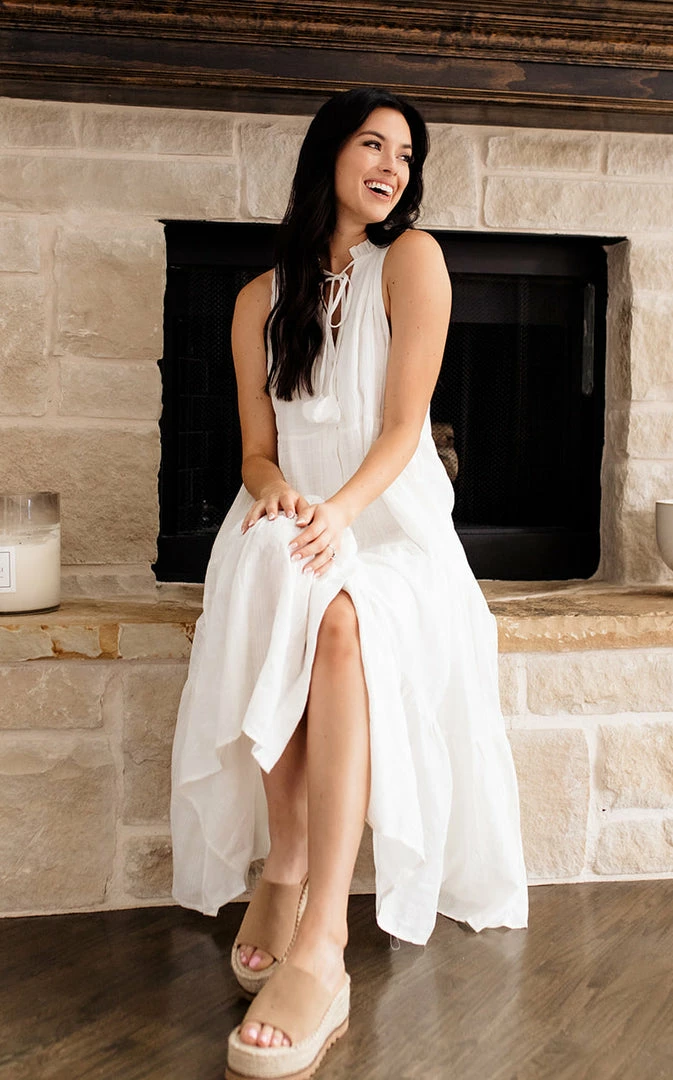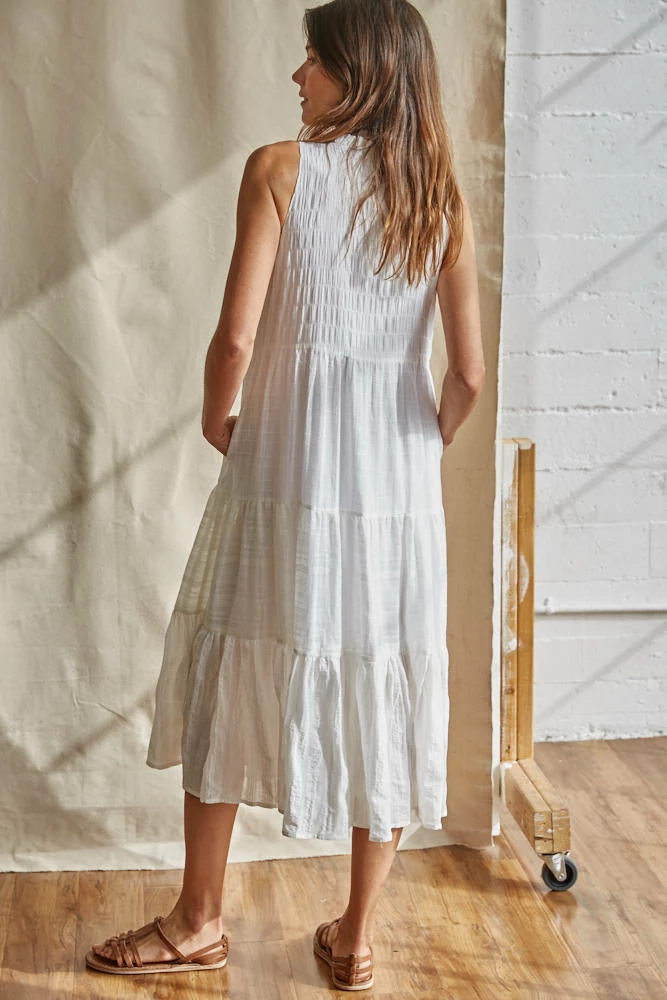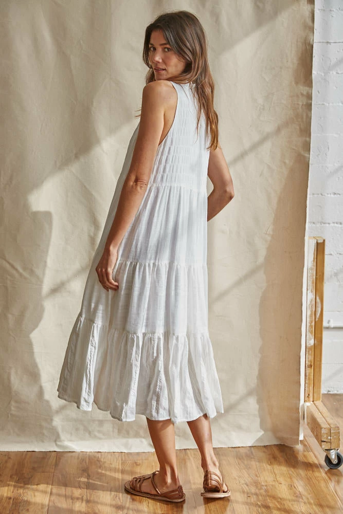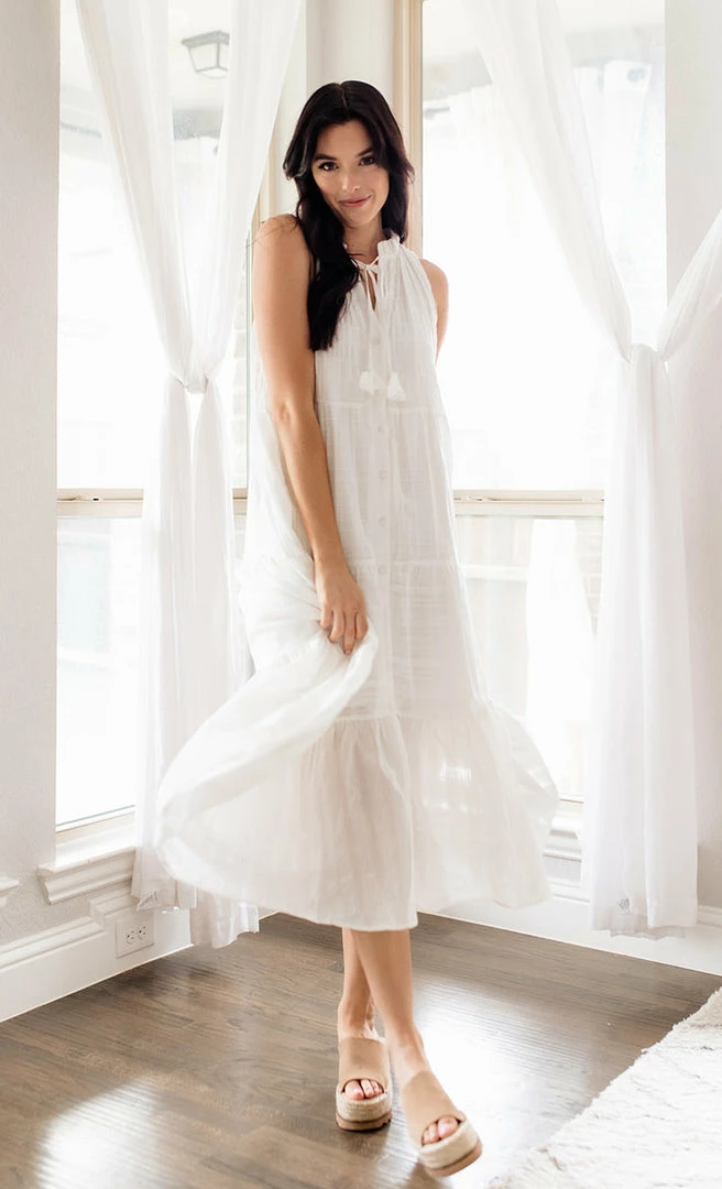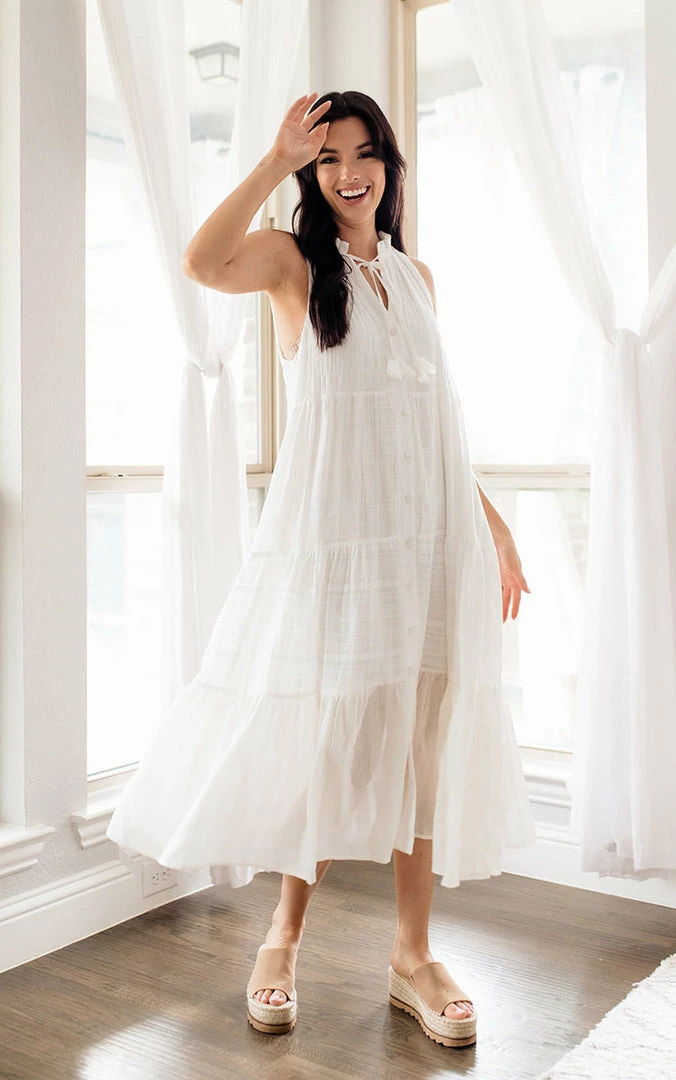 //Best Seller// Catch The Sun in our Willa Ruffle Tiered Midi Dress features a relaxed and flowy silhouette in a a off white crepey with a hint of glitter fabrication throughout.