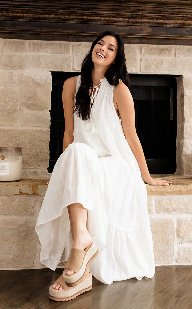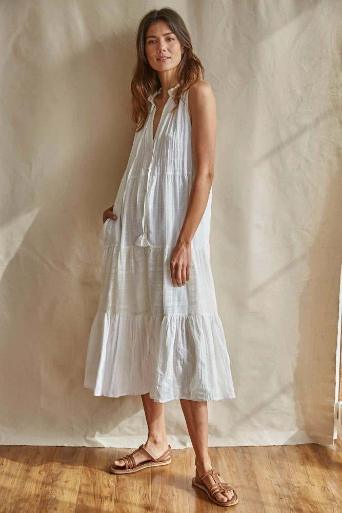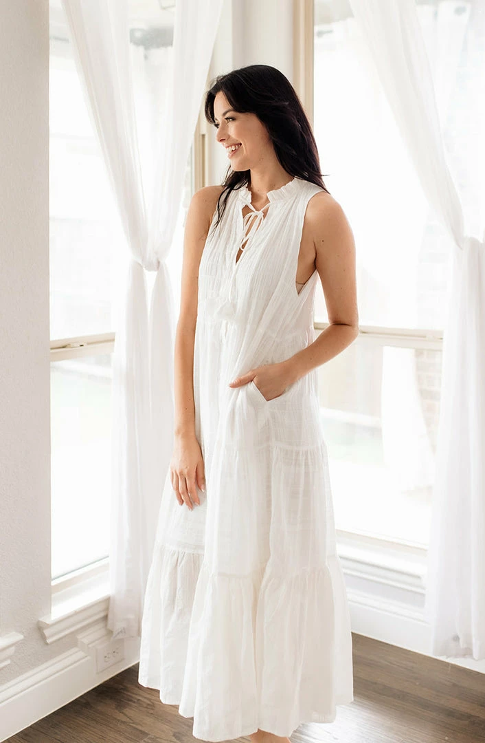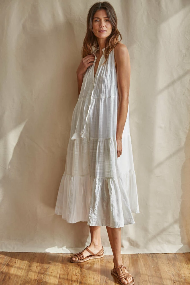 //Best Seller// Catch The Sun in our Willa Ruffle Tiered Midi Dress features a relaxed and flowy silhouette in a a off white crepey with a hint of glitter fabrication throughout.
