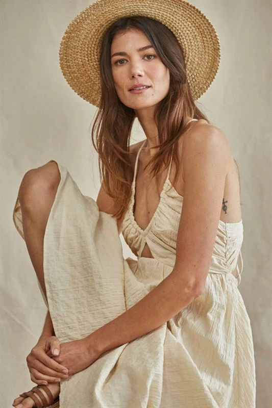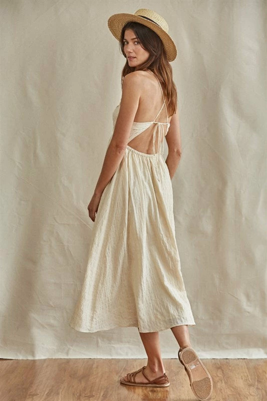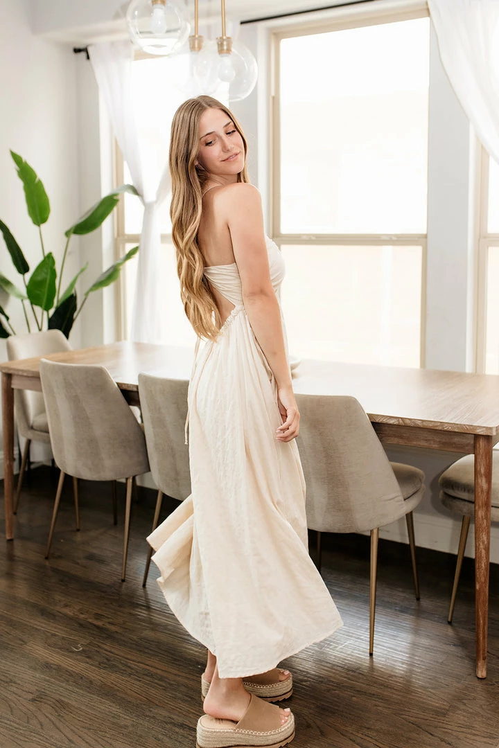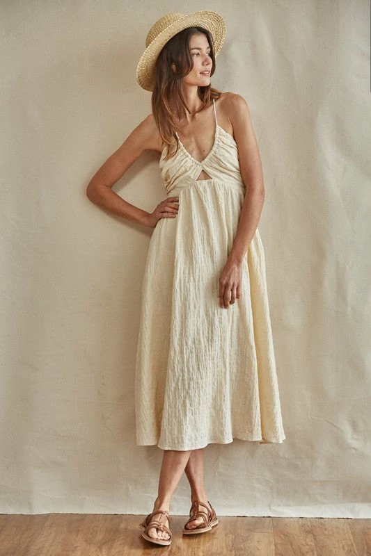 Our Yasmine Cotton Cut Out Midi Dress is so polished! Barley cotton hue makes up this true to size midi.