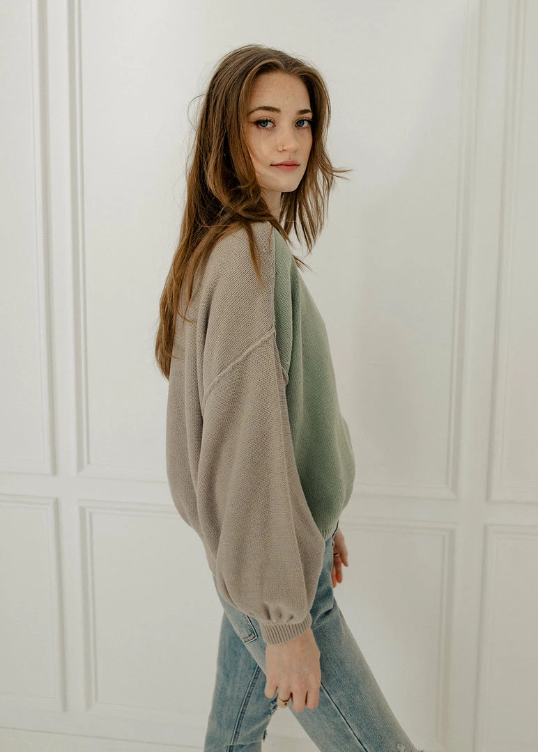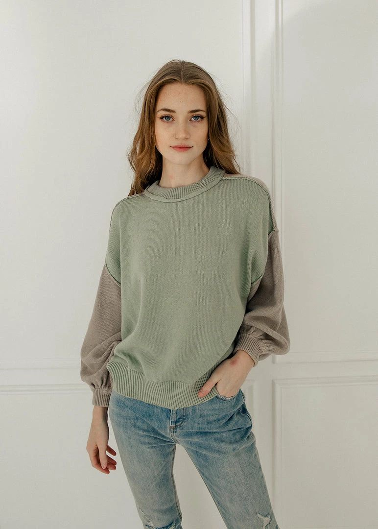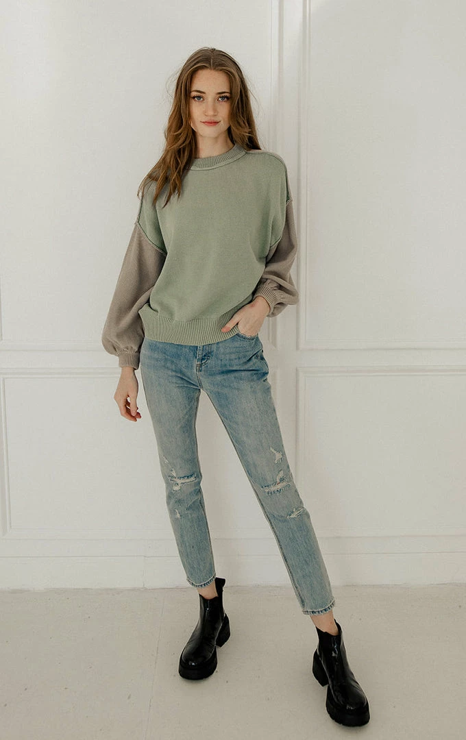 Cool grey & dusty sage color blocking is featured on the Zachary Contrast Knit Sweater. Crafted in a knit base, with reverse stitch, this trendy sweater is designed with a crew neckline and long billowed sleeves. Fashion meets function in this warm, chic style!