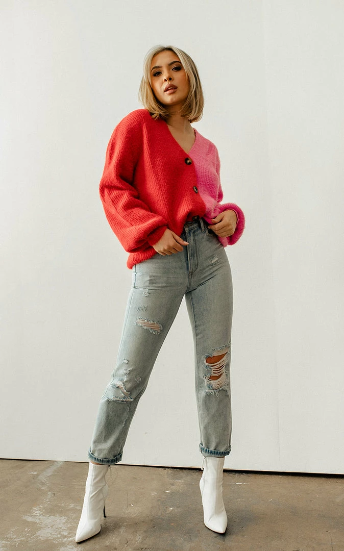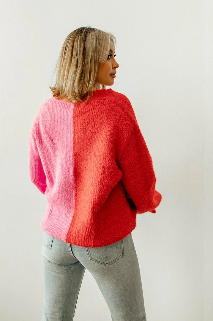Colorblock cardis are such a fun fall look! Our Shades Of Love Button Down Cardigan features red and pink bold hues. This long sleeved cardi is crafted with front button closures and pockets.