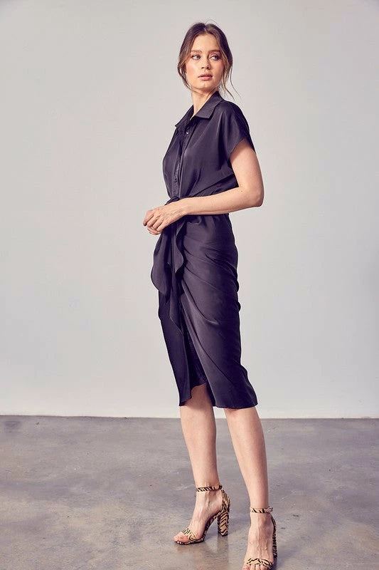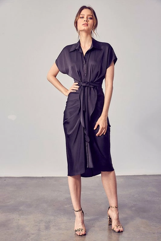 //Best Seller// New Color// For any dressier affair or work event, adorn the Just A Dream Satin Tie Front Midi Dress in a luxe black satin with a chic and sophisticated tie front.