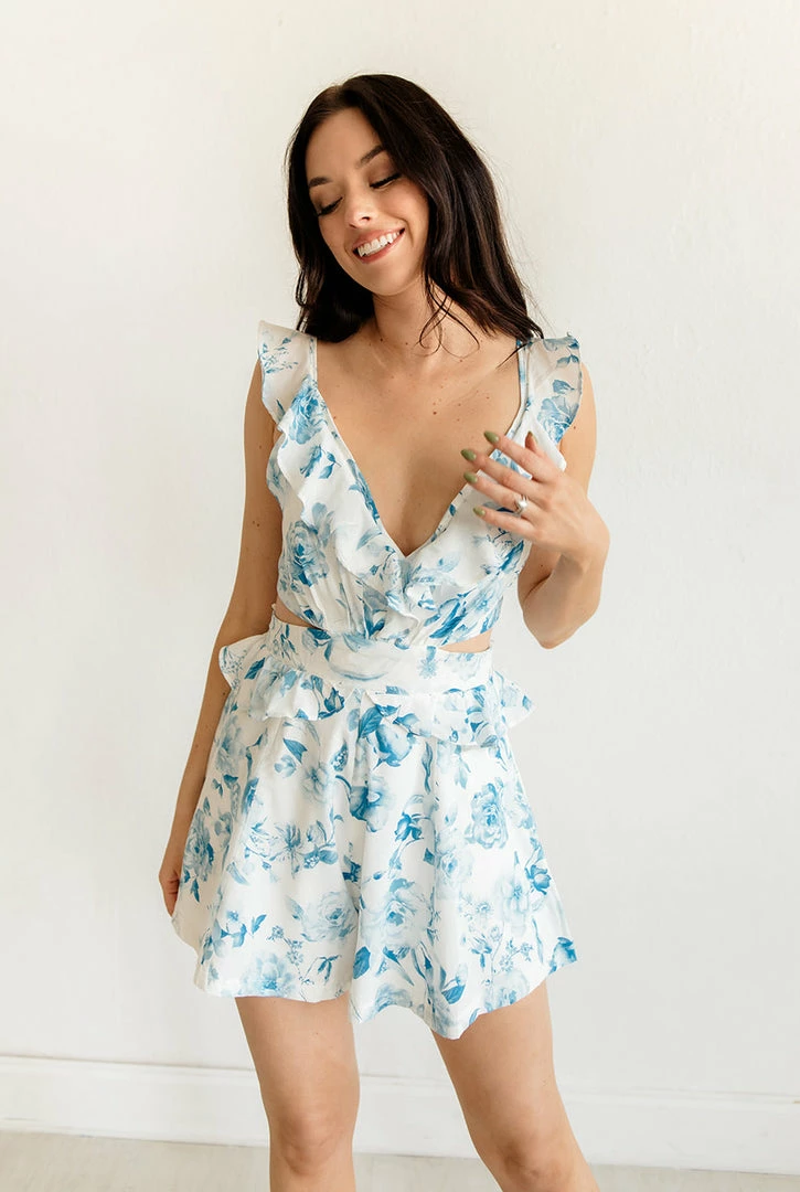 Our Fine Tune Floral Cutout Ruffle Romper is made up of the most summer-y colors! Ivory and cobalt blue florals make up this cutout romper.