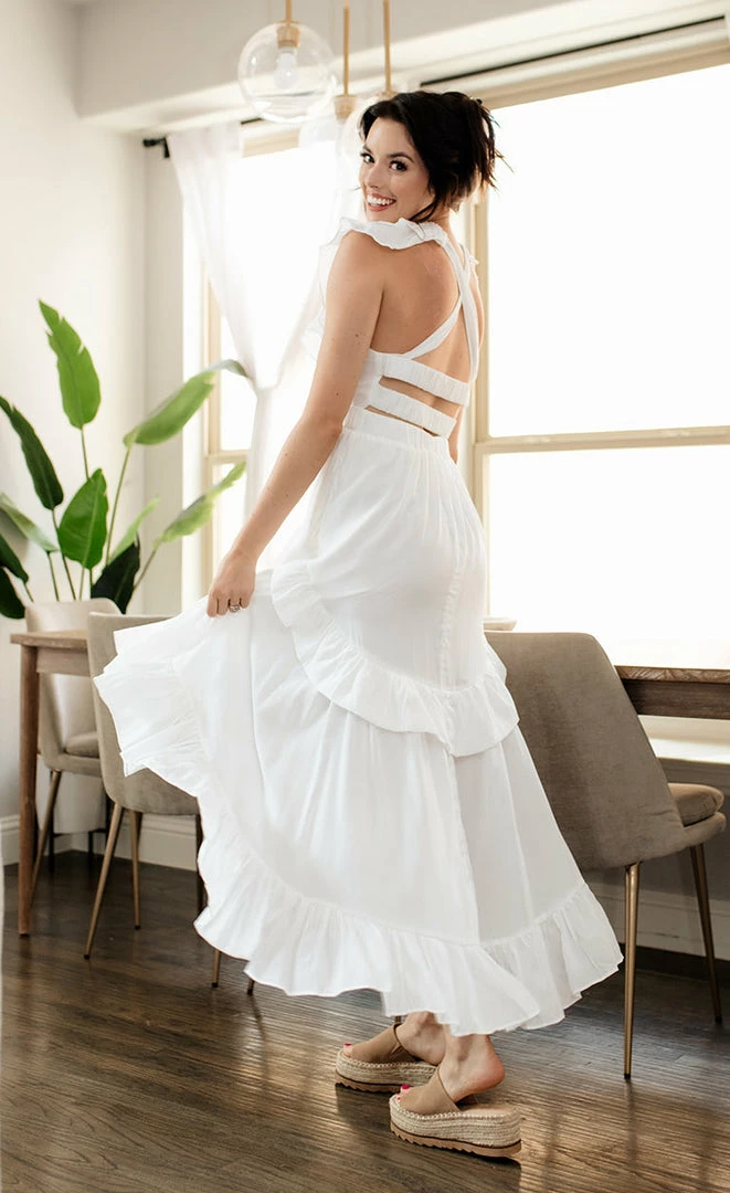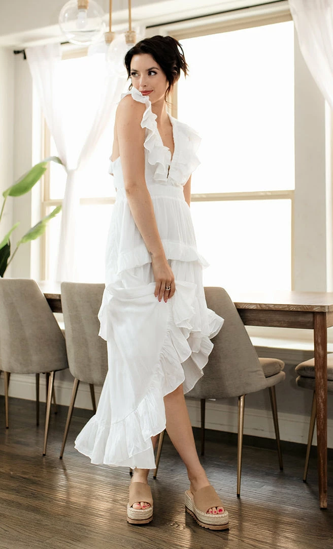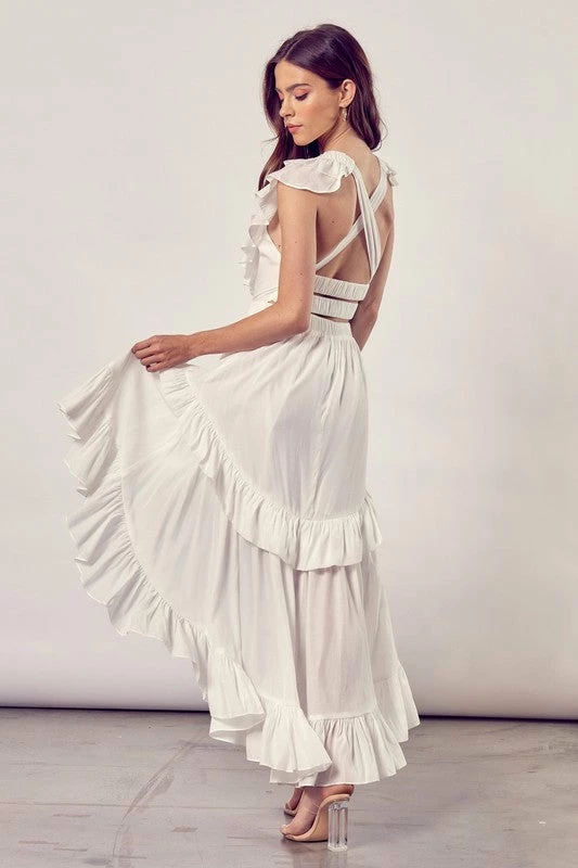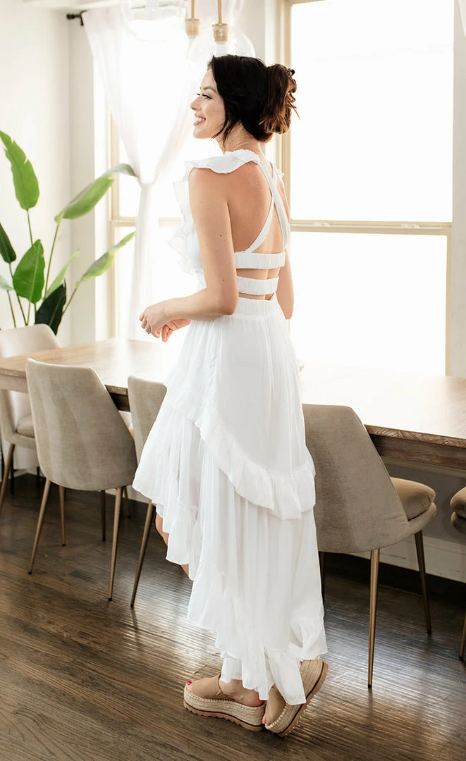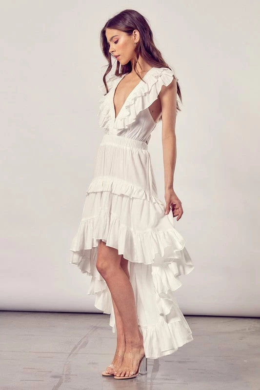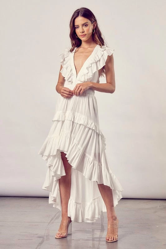Tiered ruffles accentuate the dramatic plunge neckline and high-low hem of a scene-stealing dress complete with an open back in our Emily Ruffled High Low Maxi Dress in white.