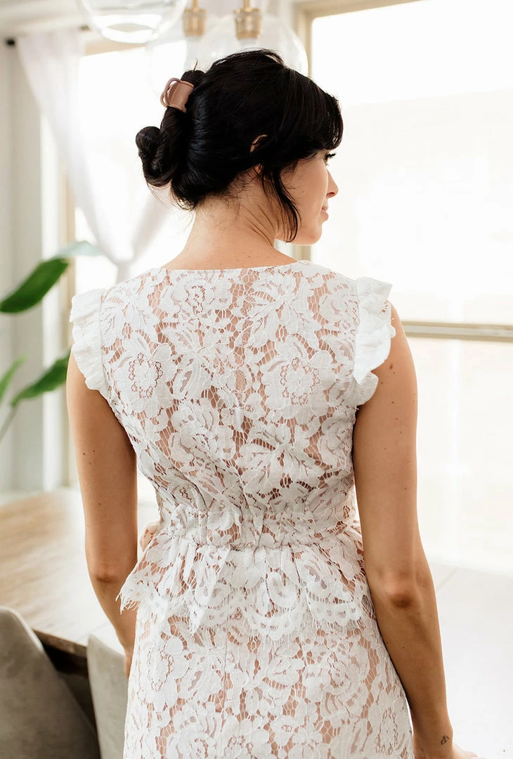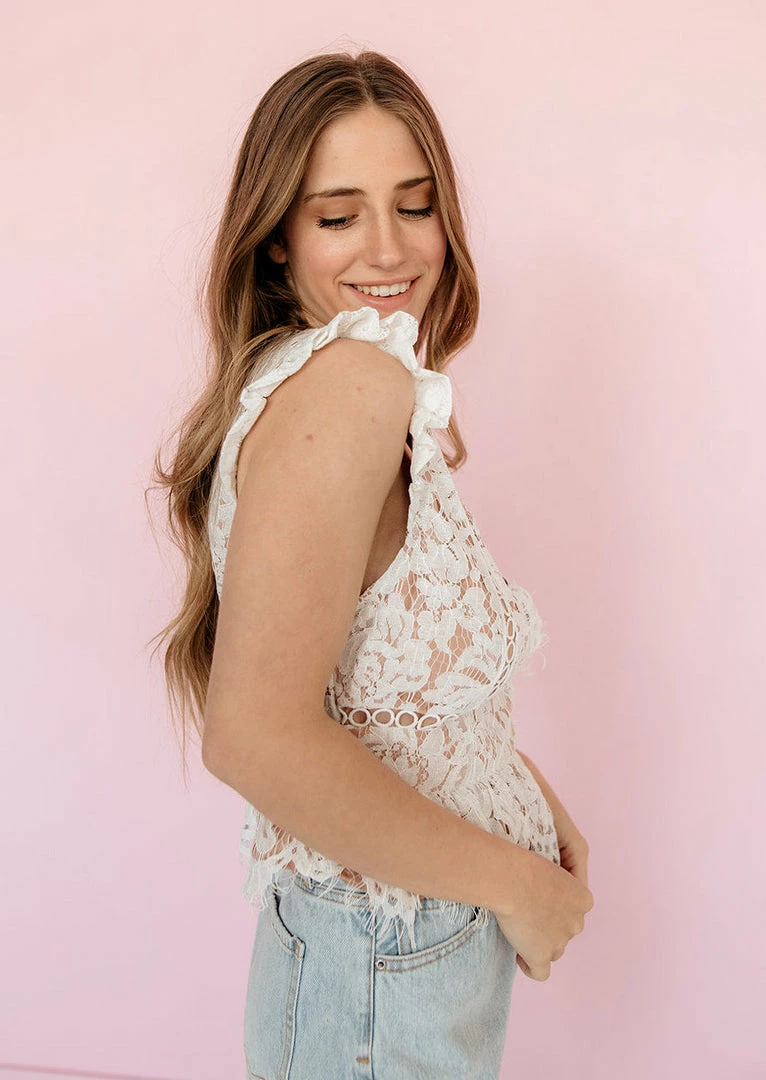 Lovely in lace, the Fabiana Lace Knit Crop Top in ivory is detailed with a ruffled scalloped v-neck neckline and short flutter sleeves.