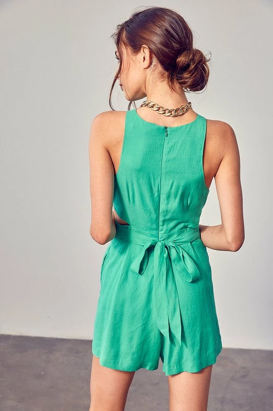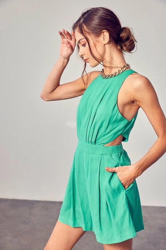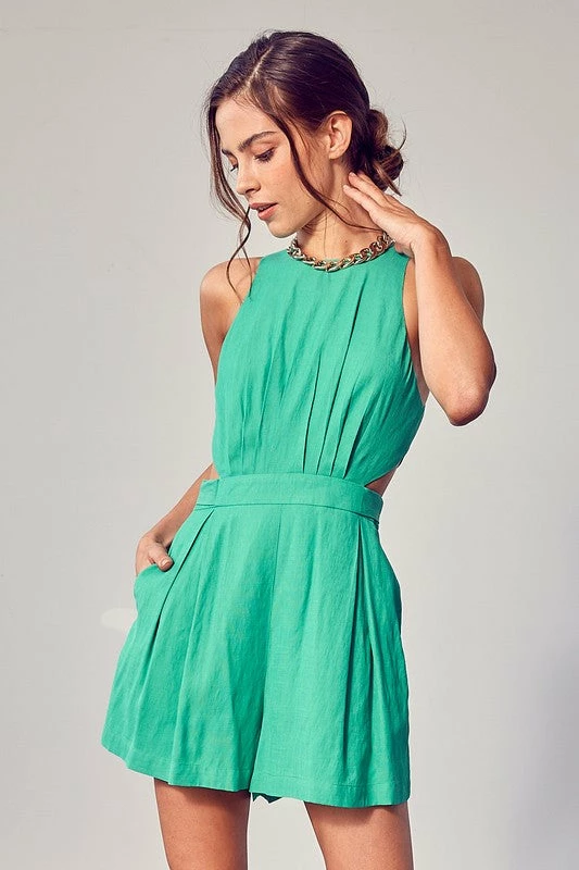 Perfect for fancy occasions, the Jaye Side Cut Out Pleated Romper in apple green features a high neckline and an adjustable waist tie.