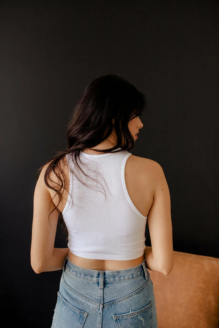 Go straight from the plane to the Provence in our Jaya Ribbed Racerback Seamless Tank! This ribbed crop top is designed with a sleeveless racerback style. Such a cute compliment to denim shorts!