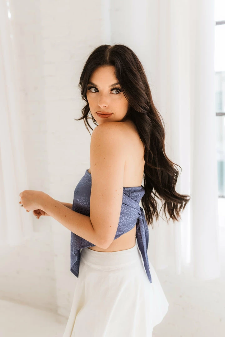 We love how multifaceted a satin tube top is! Our Iyla Satin Jacquard Tube Top comes in blue Jacquard print.