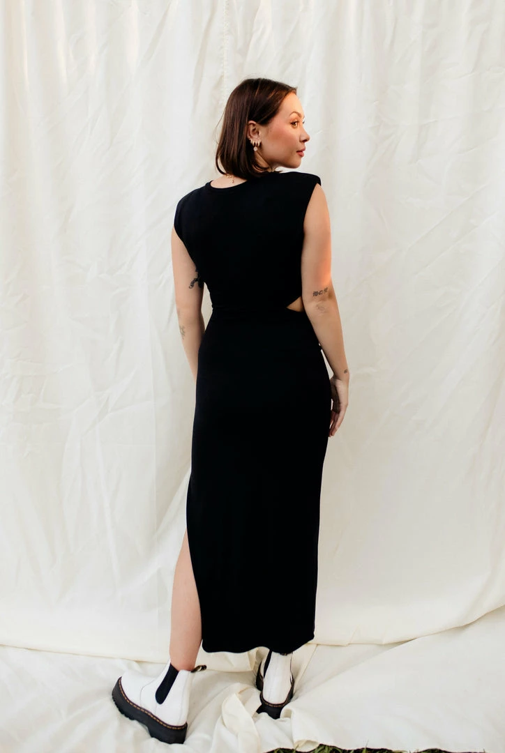 Look chic and stylin’ in our Rita Padded Shoulder Cutout O-Ring Midi Dress! This black knit maxi features non removable padded shoulders and a crew neckline. 23 inch side slits make this piece so sultry.