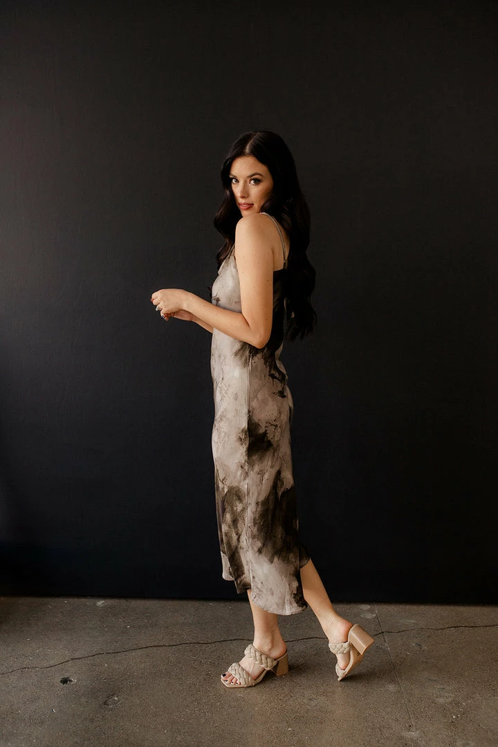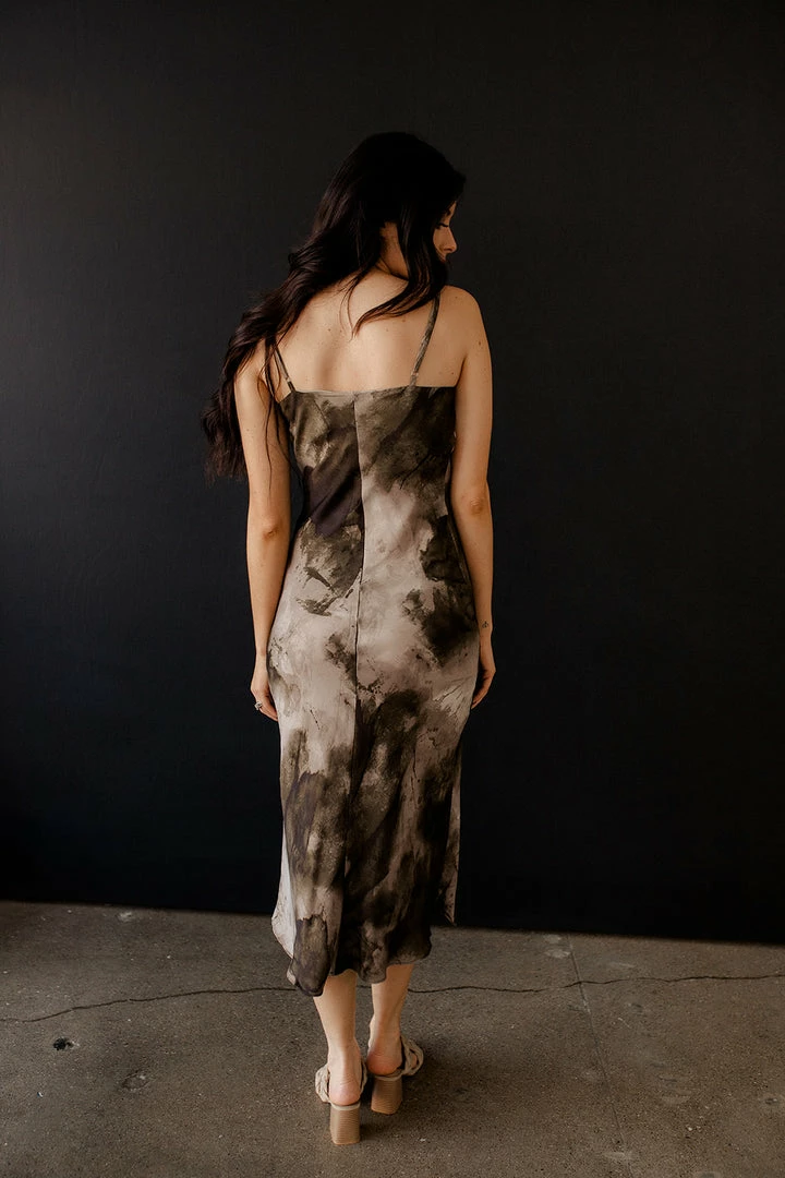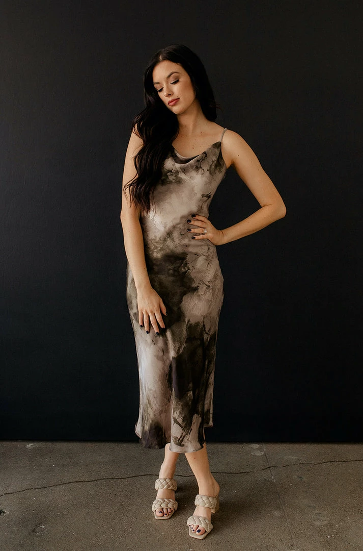 Every wardrobe needs a satin midi! Our Barron Tie Dye Satin Midi Slip Dress is olive, tan, brown & dark forest tie dye print. This satin slip dress is detailed with a cowl neckline and adjustable straps.