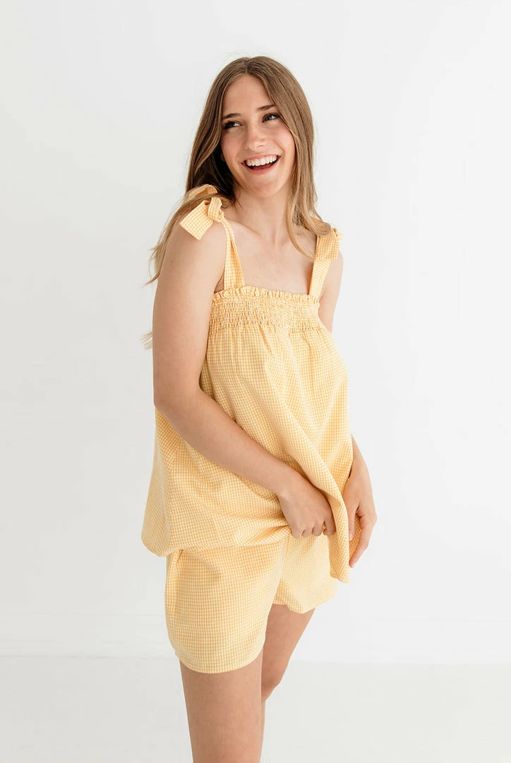 Get summer ready by the fire in this gingham set! Our Milani Gingham Elastic Waist Shorts come in an soft knit. Designed with an elastic drawstring waistband and a high rise fit. Finished with a relaxed style.