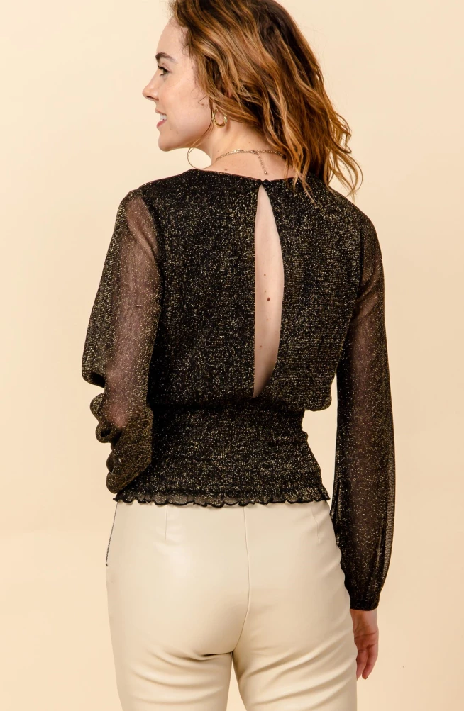 The Look And Glisten Glitter Top in black will look great over that lace bralette you’ve been dying to wear! Fitting cropped with a v-neck neckline and billowy sleeves, it’s the perfect layering piece or can be worn alone with mid-rise denim. An elastic waistband secures the look!