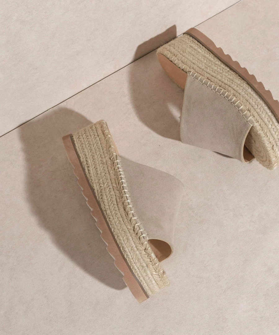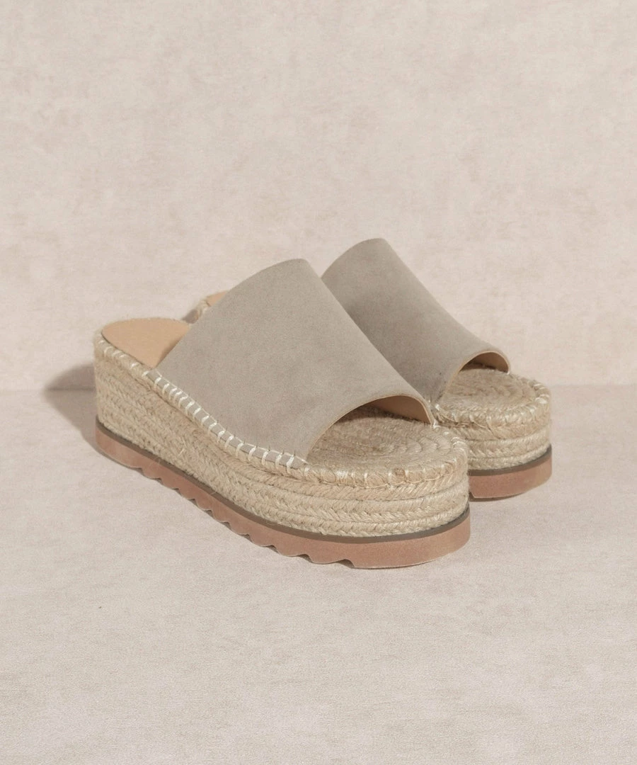 Our Shilo Platform Espadrille Sandal is made for spring and summer days! These grey faux leather woven strap espadrille sandals have a jute platform and a rubber sole. Finished with an open toe.