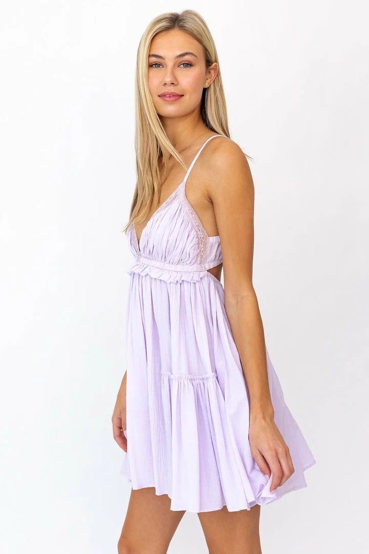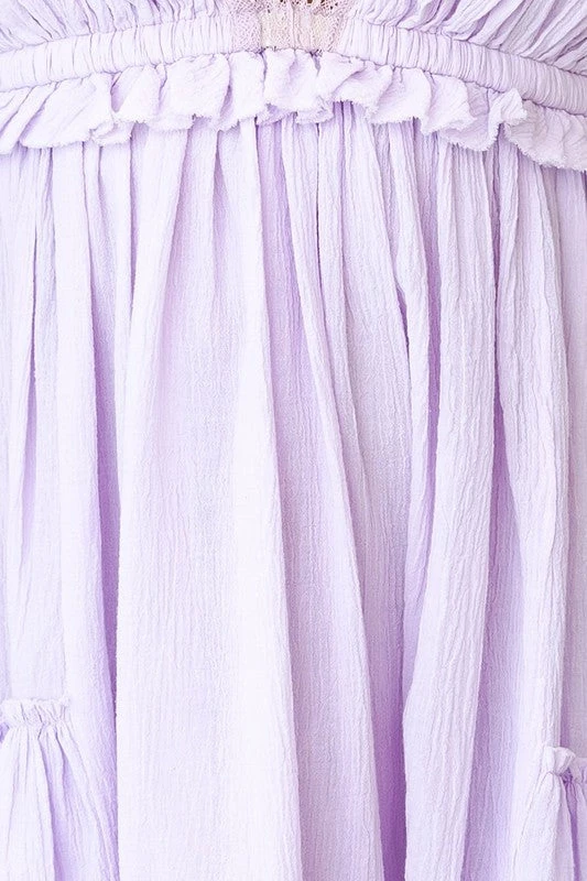 Our Gracie Cotton Babydoll Dress is made to be worn with your new espadrille sandals! This lavender cotton dress has an open back keyhole for a boho look. Finished with a elastic trim front/back detailing throughout.