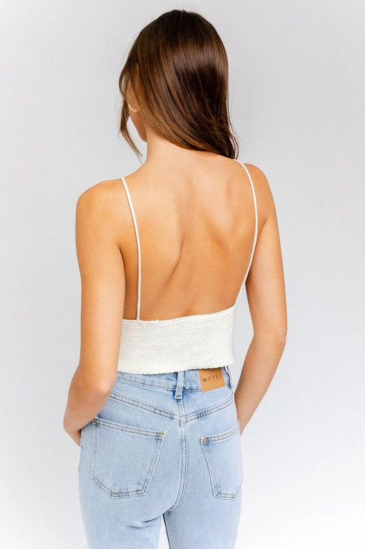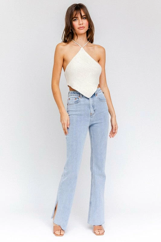 Bring the heat next date night in our Big Island Cotton Halter Crop Top! This off white knit crop top is detailed with a halter neckline and a back tie closure. Wear this trendy piece with high rise denim and shorts.