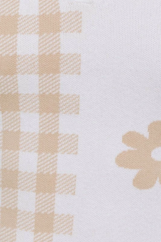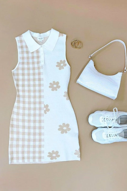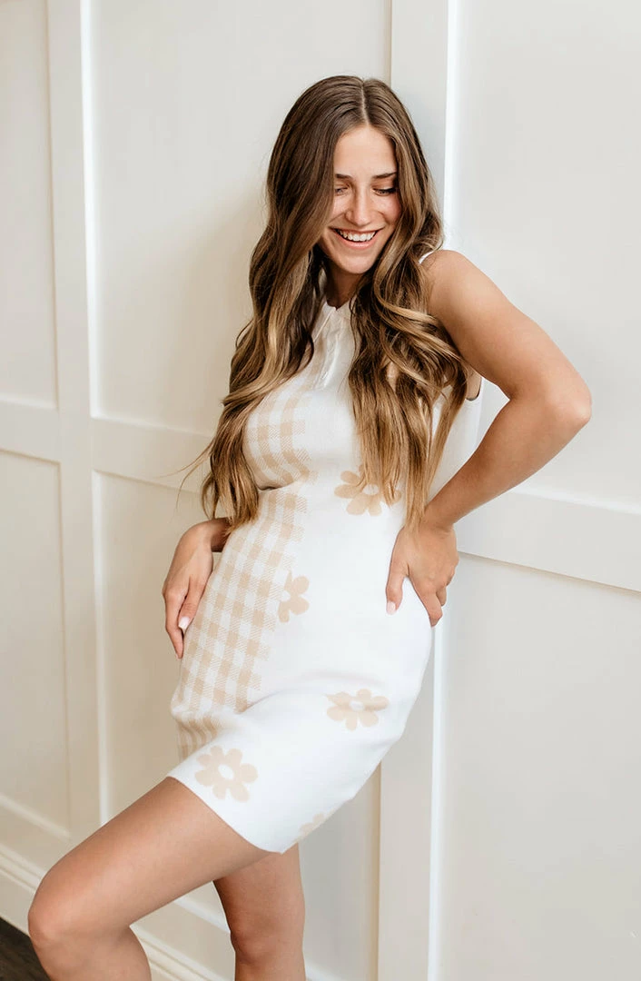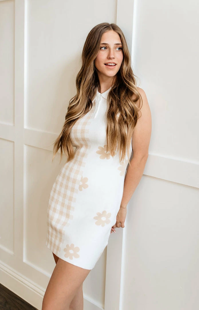 Designed for warmer weather, the April Collared Sweater Mini Dress in taupe and white features a checkered & floral print.