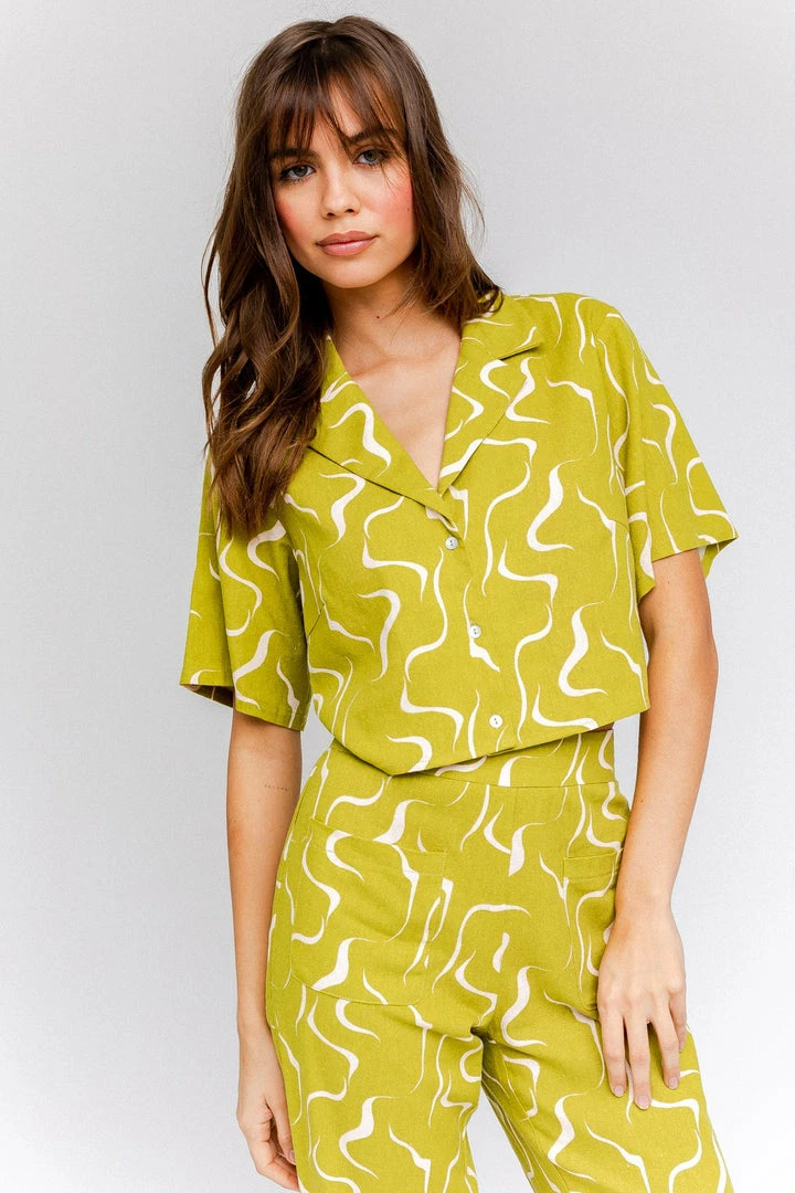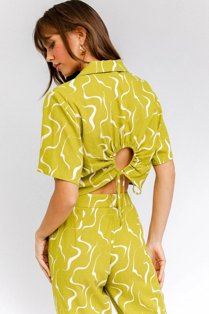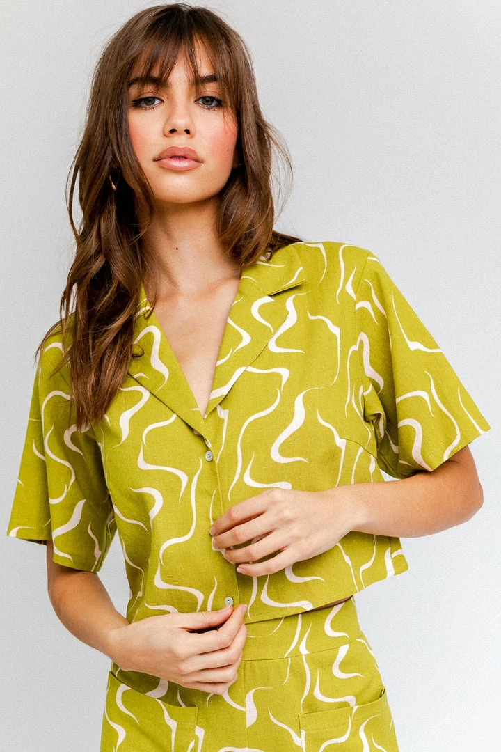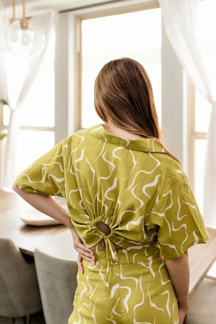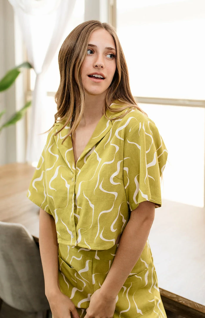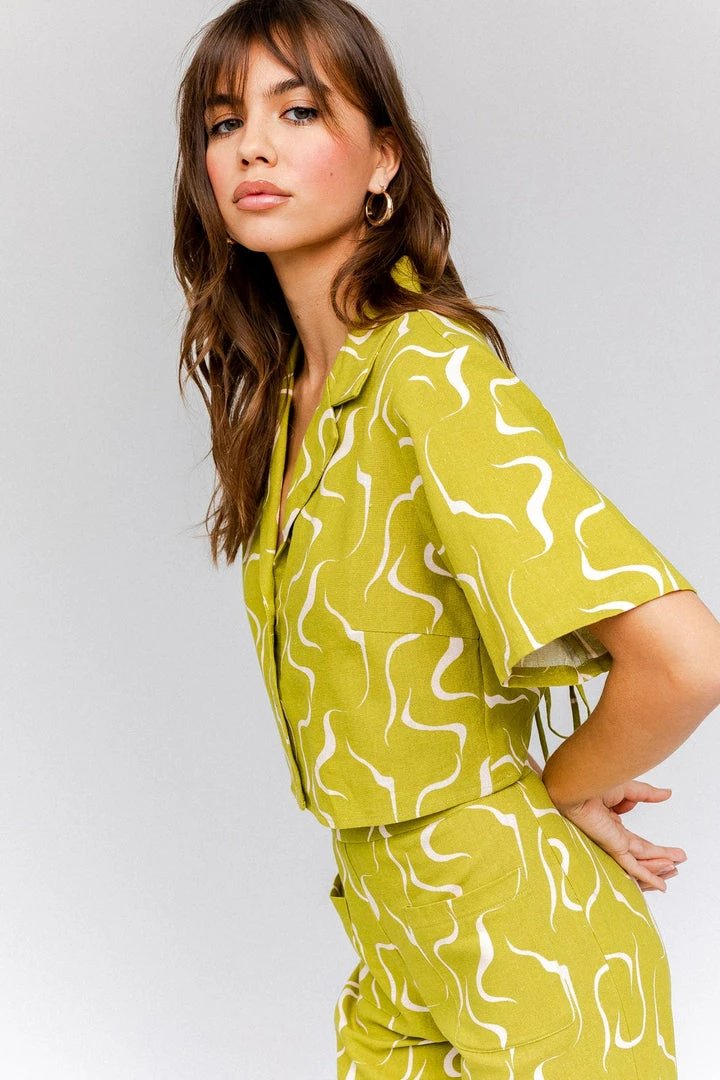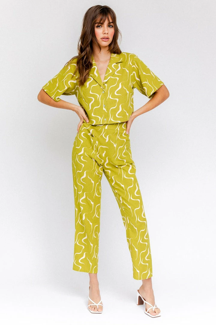 Our Exposition Linen Abstract Crop Top come in an green linen blend complete with a wide pant leg. Finished with a invisible zipper back closure. Styled with the matching top.