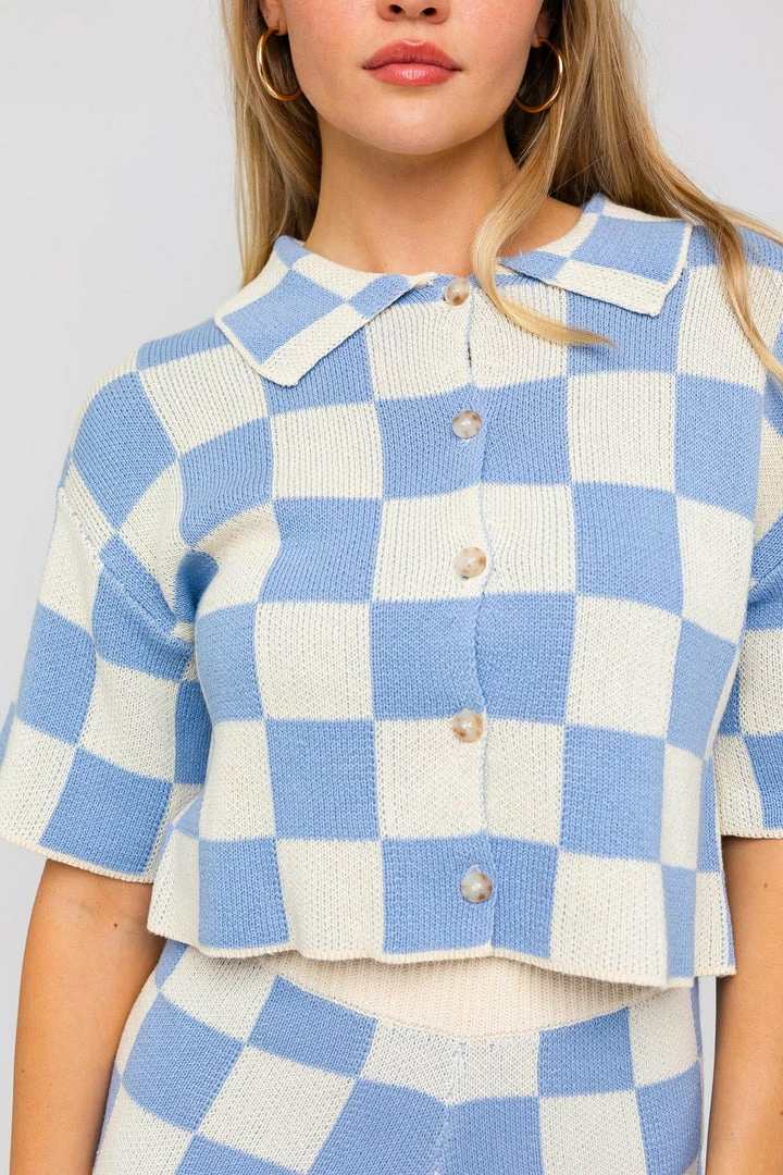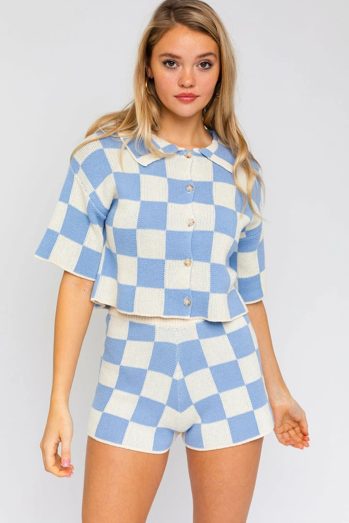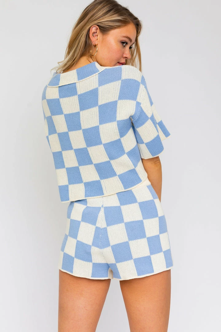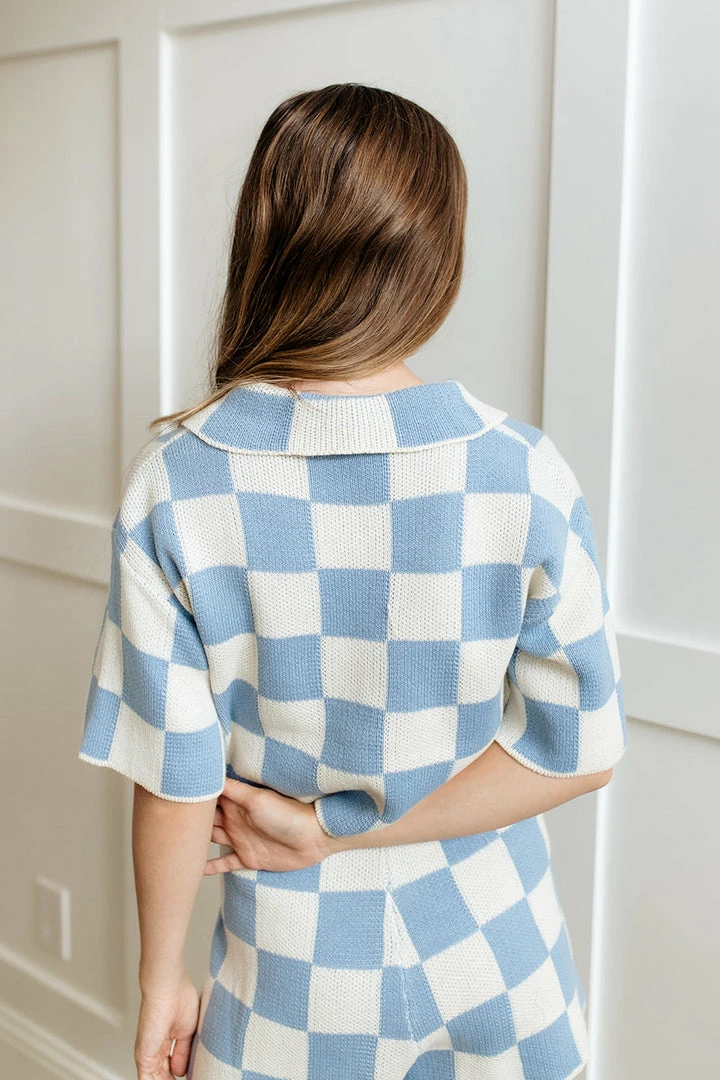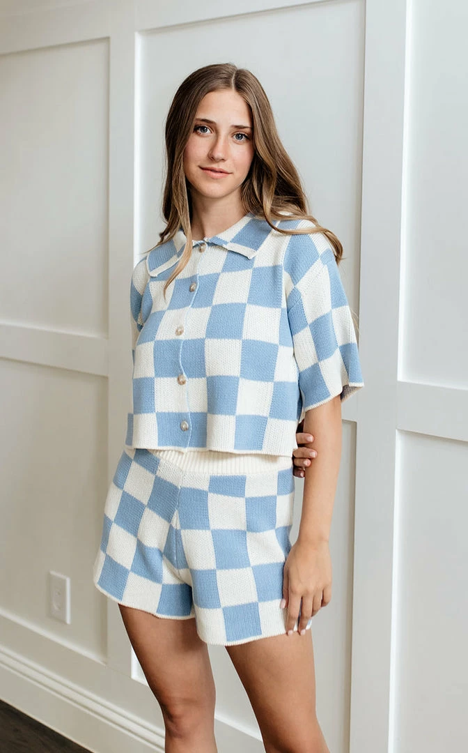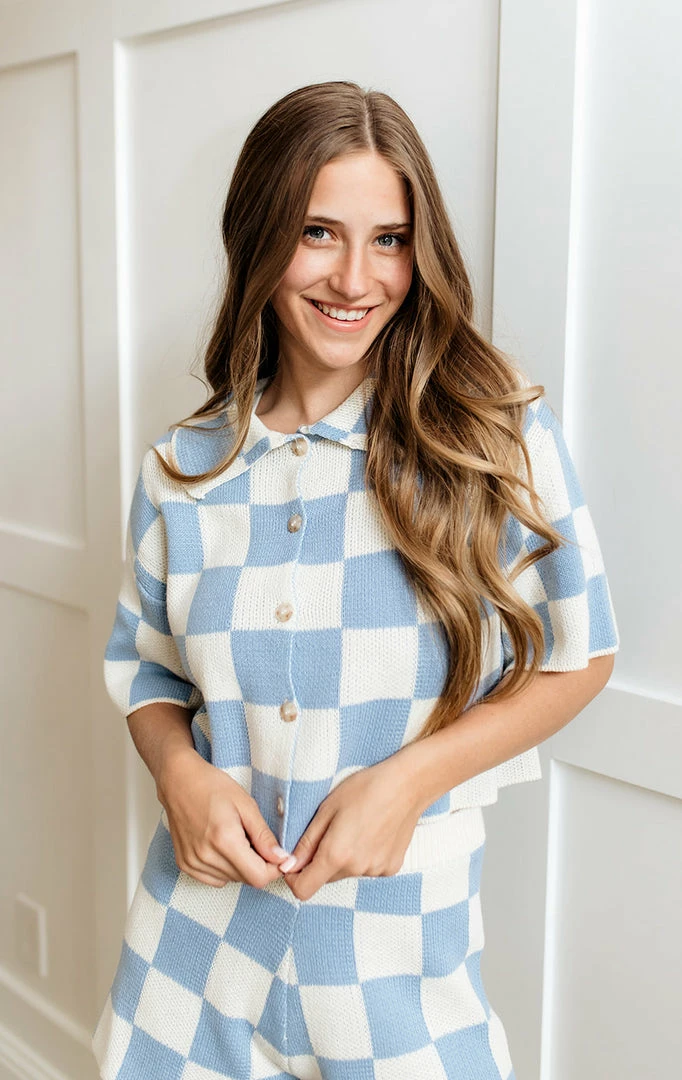 Our Jessie Checkered Collared Knit Top pairs fabulously with the matching shorts and white heeled sandals. This baby blue and off white top has a notched collar and front button closures. Styled with the matching Jessie Shorts (sold separately).