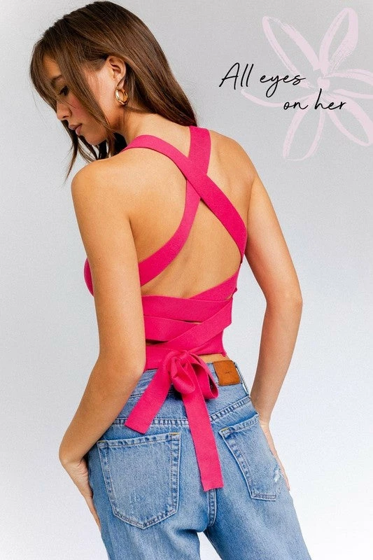 Our Tina Tie Back Crop Top is ideal for going out or a chill sunday brunch! This top is a party in the back with its adjustable criss cross tie closure. The square neckline makes the front look so chic.