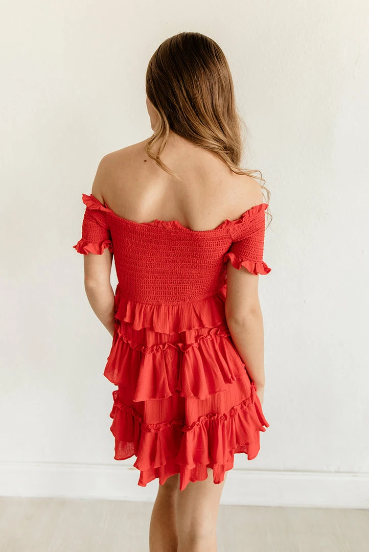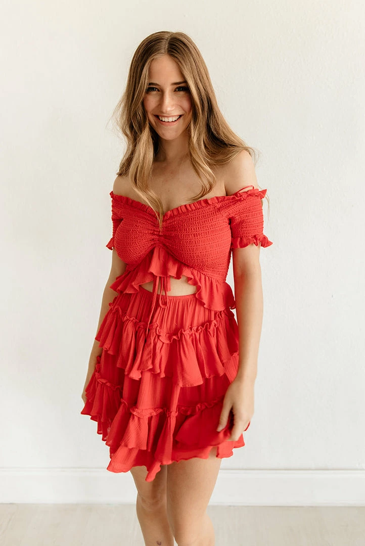 The cutest off shoulder smocked front drawstring tier ruffled mini dress. Front cutout detail.