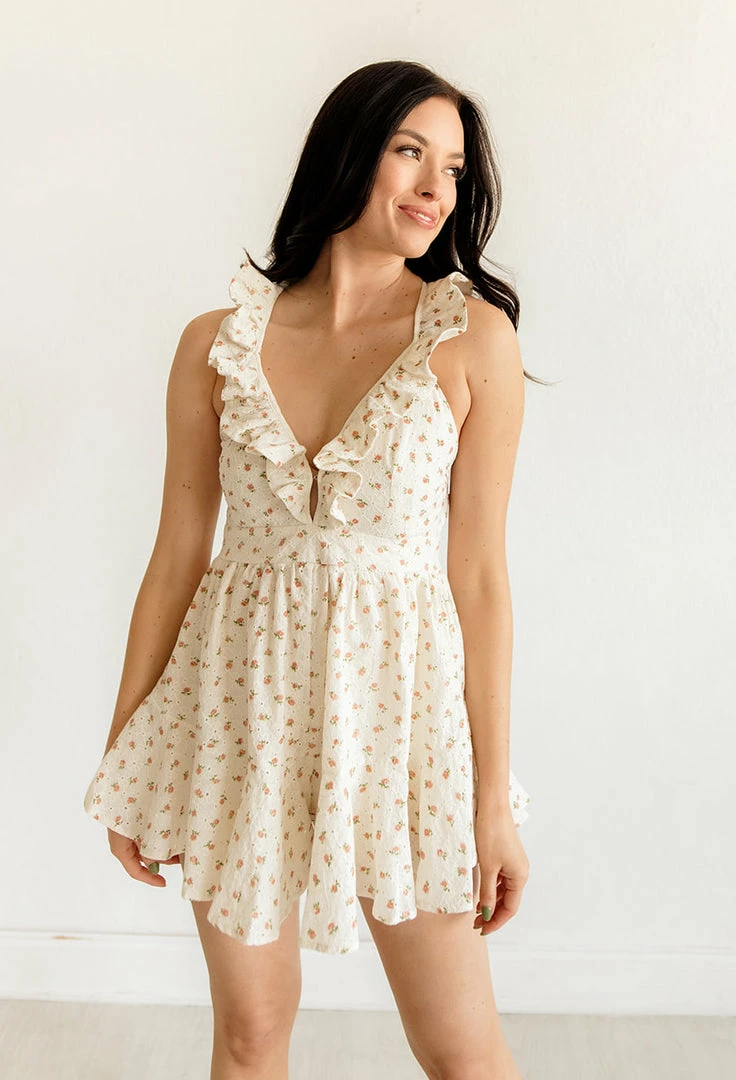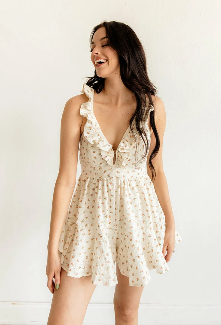 Summer meets fab in our Claire Cotton Eyelet Ruffle Romper! In a beautiful off white, eyelet fabrication, this ruffled romper has a detailed adjustable back straps and a relaxed fit shorts. Finished with ruffle details & floral print throughout.