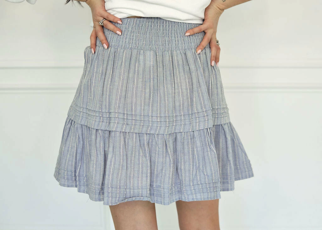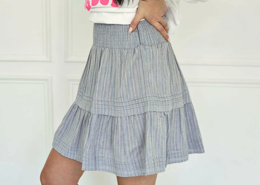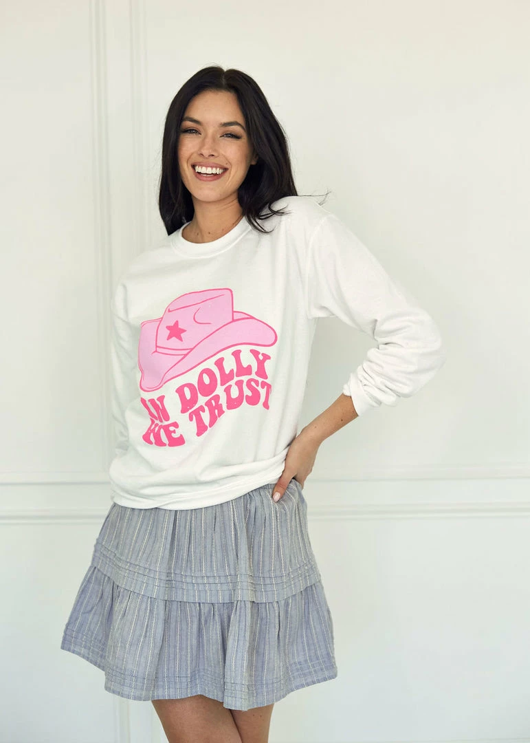 This pretty skirt is made for summer days! Our Happy Anywhere Smocked Ruffle Mini Skirt pairs fab with the any graphic tee. Finished with an elastic waist. Styled with our Dolly Graphic Sweatshirt.