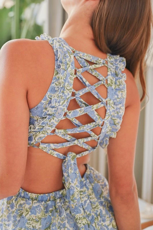 A dress that’s so detailed, you’ll need to have it! Our Jaclyn Floral Ruffle Tiered Cutout Dress is a blue & white floral design with a v-neckline and side cutouts. The back of this beauty is so sexy with a back lace up closure.