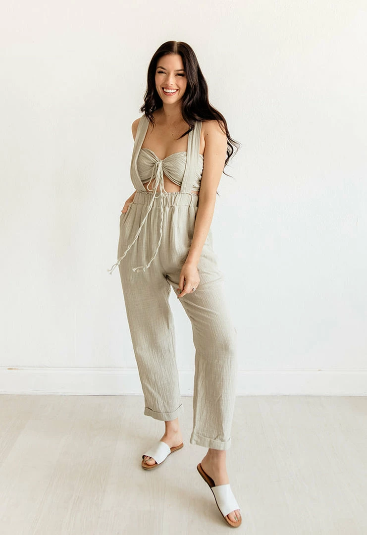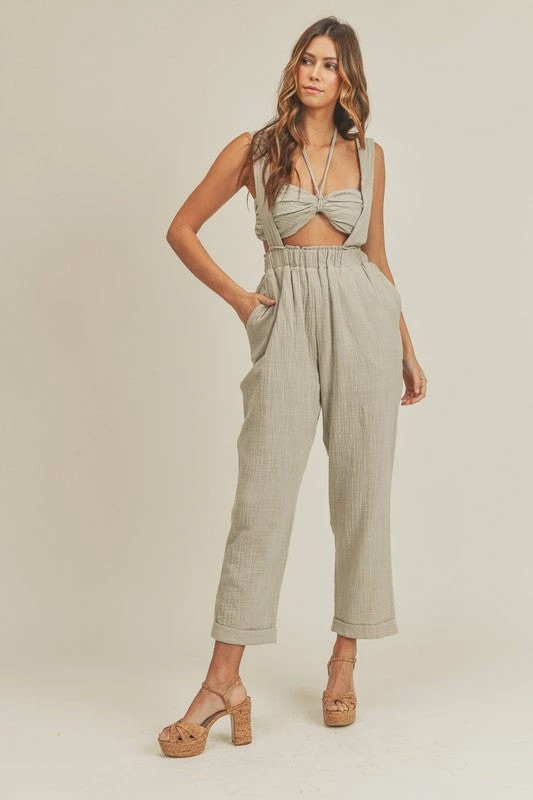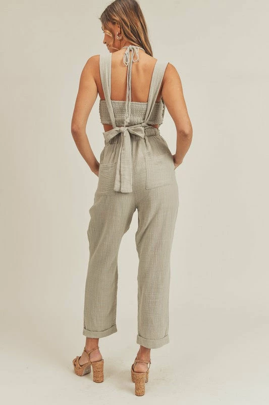 The summer set of your dreams! Our Ralphie Smocked Halter Crop Top comes in dusty olive/taupe hue. Designed with an adjustable halter neckline and a smocked body. Wear this top with the matching overall pants and espadrilles.